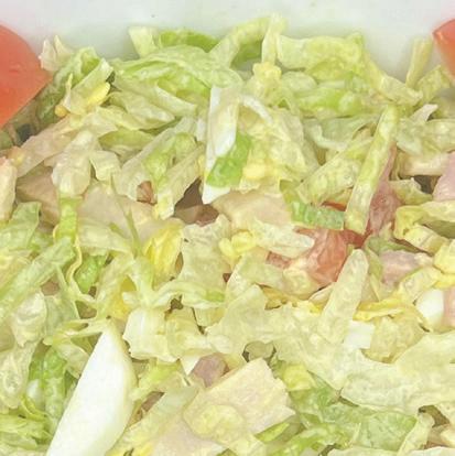 • Mix all ingredients except for tomato and egg wedges and dressing thoroughly in a bowl. Garnish with tomato and egg wedges.