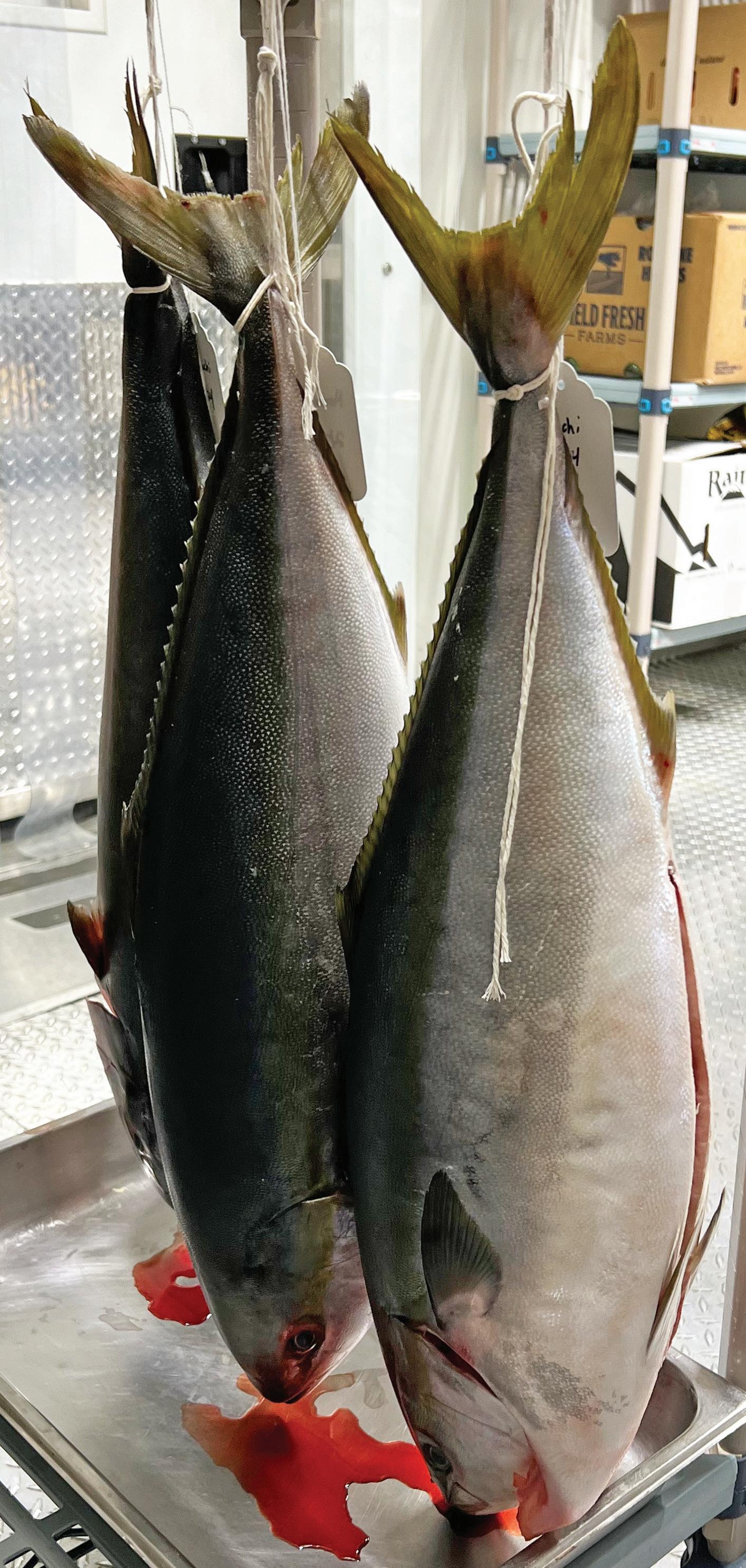 “Given the success with salmon and the limited capacity of our dry ager, we began experimenting with hanging different types of fish in a regular refrigerator for 24-48 hours to drain the blood,” says Matarazzo.