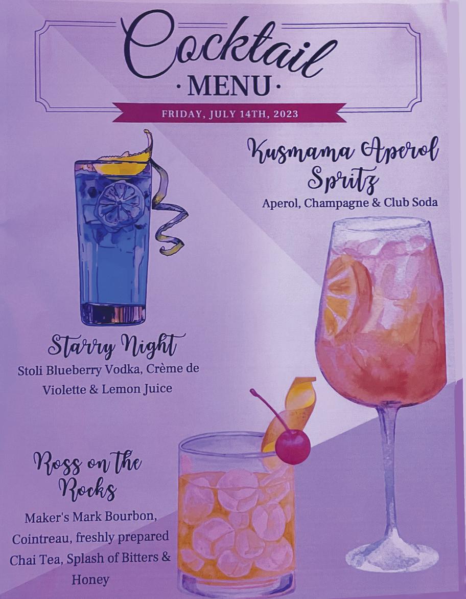 Specialty cocktails, designed by the club’s bar manager and assistant general manager, included the Starry Night (blueberry vodka, creme de violette and lemon juice), Ross on the Rocks (bourbon, Cointreau, fresh chai, bitters and honey) and an Aperol Spritz variation.