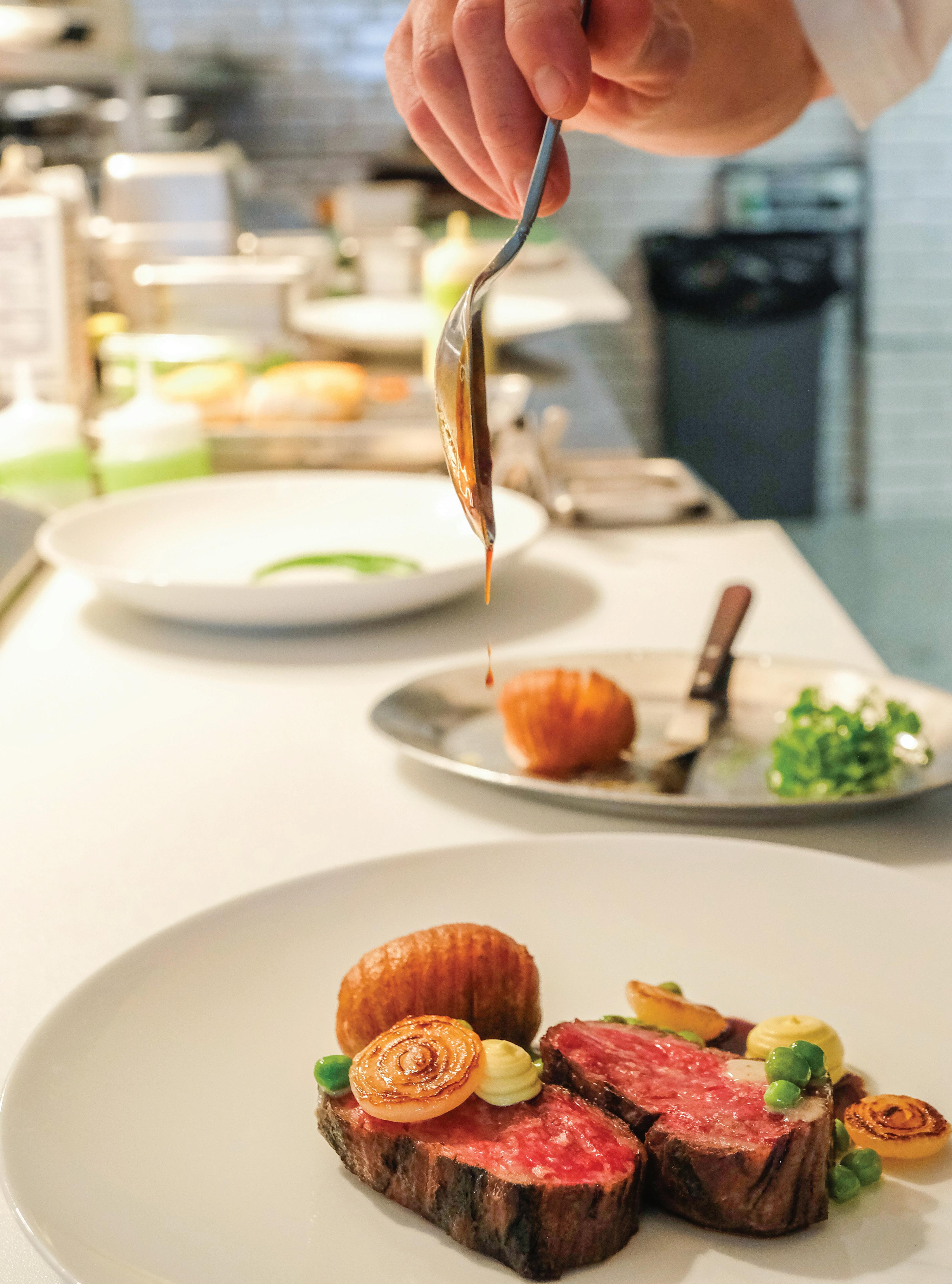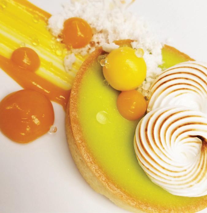On the dessert cart, Bennett o ers a wide range of textures and flavors for any palate: citrus, chocolate, nuts, crunch, frozen, and fruit. “We always have a cheesecake of some sort because it’s relatable,” he says. “And because we’re in the States, there’s always something with peanut butter.”