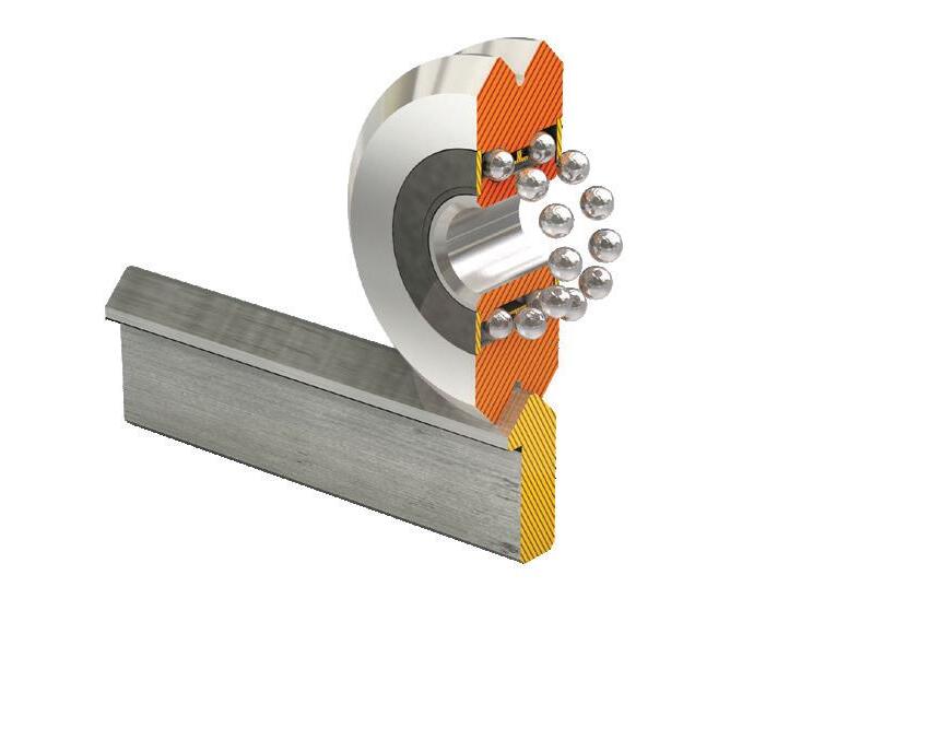 Double row V-Wheels ride on an embedded steel raceway for pre-aligned high performance