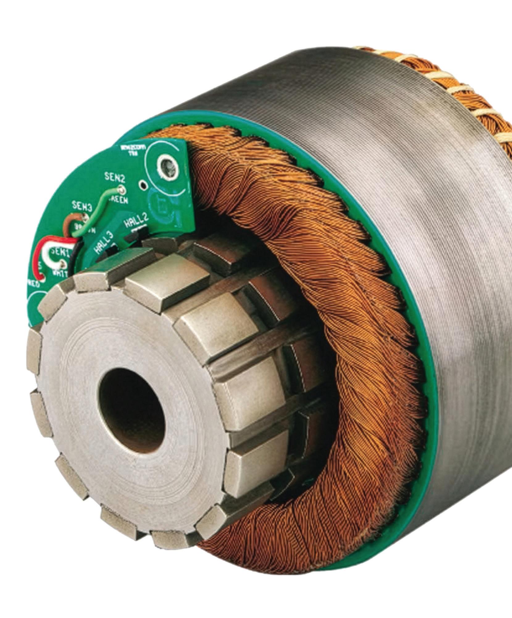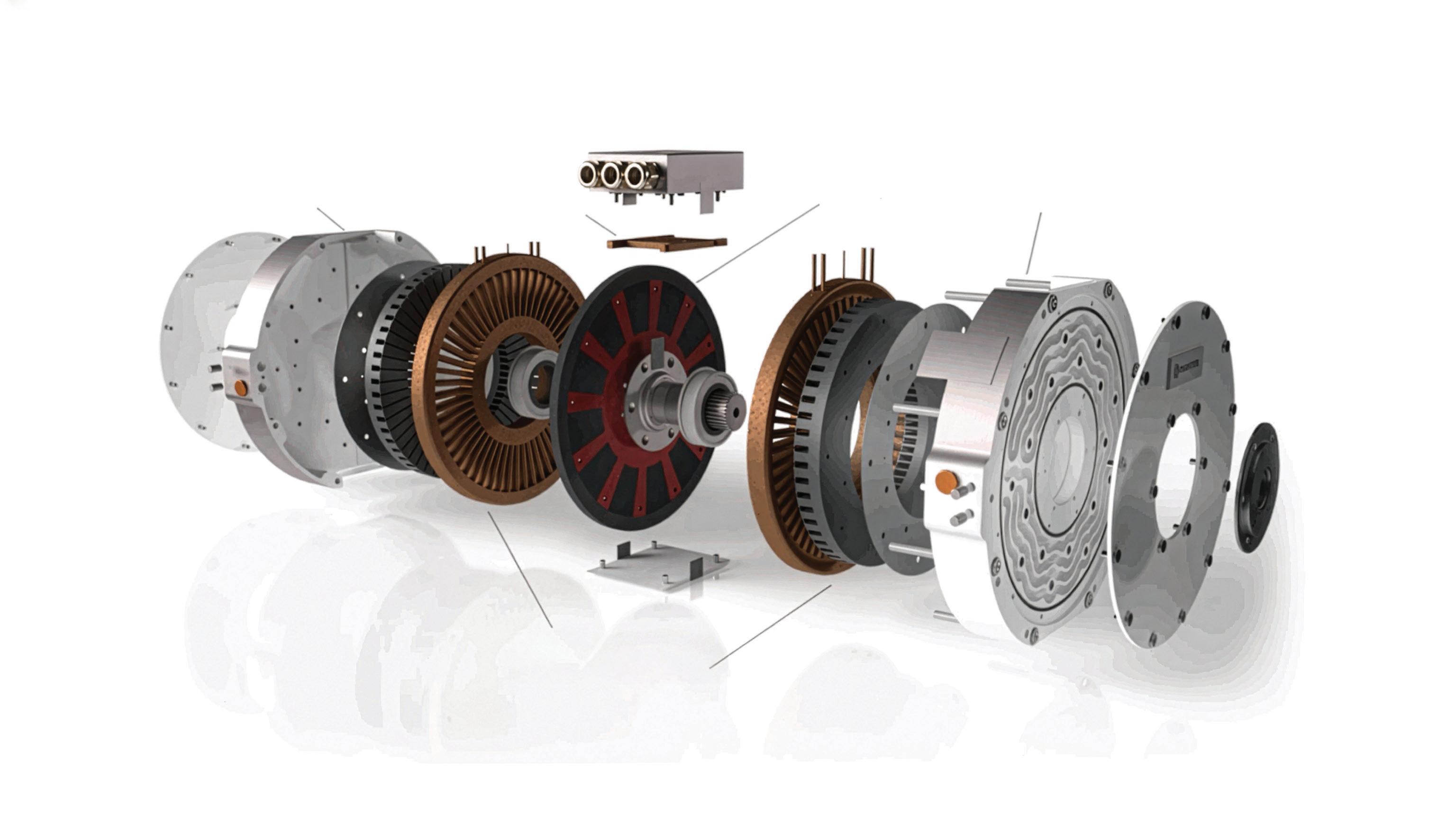 FIGURE 3. Exploded view of an axial flux motor: scalable stators, advanced cooling, and composite rotors all benefit from highvoltage EV architectures that reduce current and thermal stress.