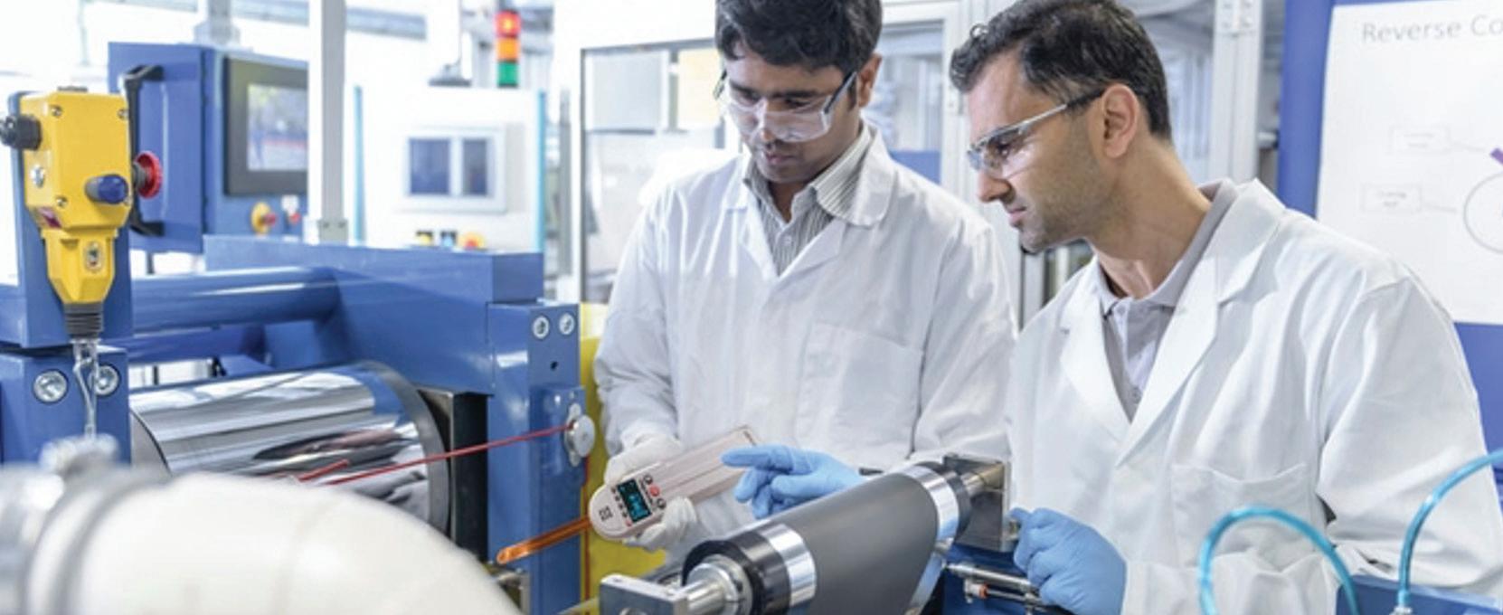 Non-contact capacitive gap sensors are used to set coating thickness in the EV battery manufacturing process.