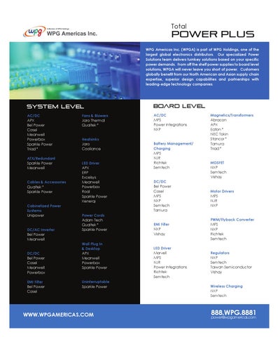 power Plus WPG Americas Inc. (WPGA) is part of WPG Holdings, one of the largest global electronics distributors. Our specialized Power Solutions team delivers turnkey solutions based on your specific power demands. From off the shelf power supplies to board level solutions, WPGA will never leave you short of power. Customers globally benefit from our North American and Asian supply chain expertise, superior design capabilities and partnerships with leading-edge technology companies.