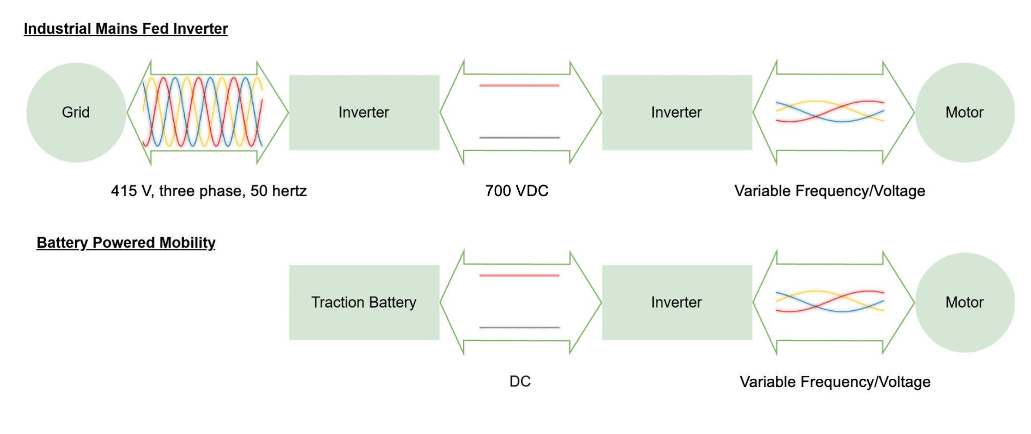 FIGURE 2. How inverters manage voltage conversion in grid-fed and battery-powered EV systems.