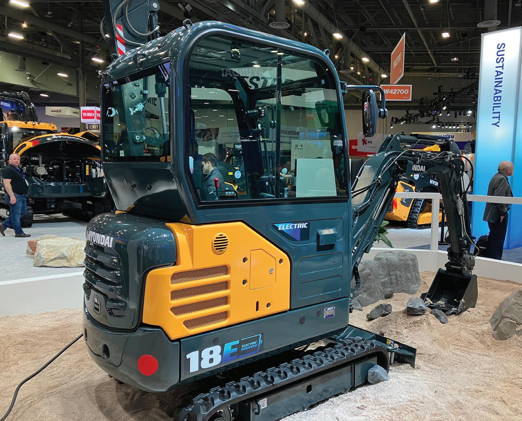 Hyundai Construction Equipment Americas demonstrated working prototype models of electric-powered equipment, including an R18E compact excavator. The two-ton-class