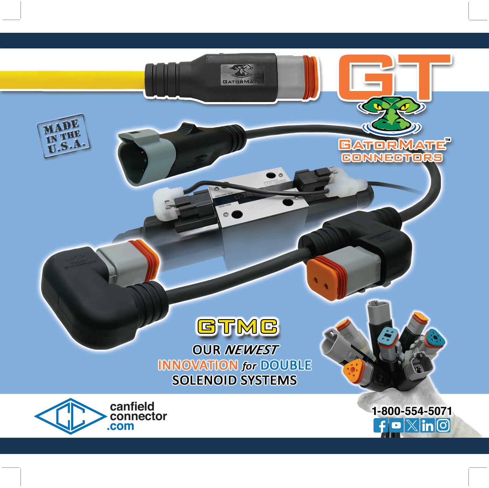5JMC series double solenoid ISO DIN molded connector is engineered to simplify wiring and enhance reliability for DO3 and DO5 hydraulic valve applications. Two solenoid valve connections are combined into a single over molded assembly — allowing for separate control or parallel control configurations while reducing wire runs, pass-throughs, and control box connections. Molded polyurethane housing and integrated gasket deliver NEMA 6/IP67-rated sealing for long-term environmental protection. Ultrabright LEDs are visible from 360°, providing easy diagnostics in any orientation. Low-profile 90° cord exit enables installation in tight valve manifolds, while optional surge suppression (MOV or diode) and multiple wire configurations allow for flexible OEM integration.