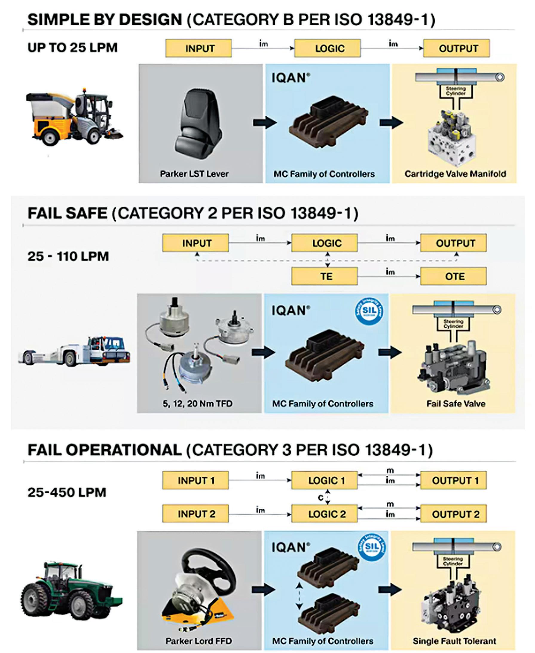 Steering a tractor is very different from steering forklifts. That’s why there is no one-size-fits-all design when converting to steer-by-wire. The type of vehicle, application and performance requirements, as well as the necessary level of functional safety, must all be taken into consideration. Steer-by-wire systems are gaining in popularity because of their design flexibility, operator comfort, increased safety and lower overall costs. But safety concerns persist due to their autonomous nature. These newer systems must meet multiple safety standards, and have redundant warning systems to ensure machine failures are flagged in advance to minimize user and OEM liability. FPW Parker Hannifin parker.com