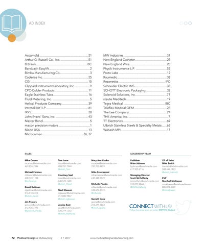 Accumold.............................................................21 Arthur G. Russell Co., Inc....................................51 B.Braun................................................................BC Bansbach Easylift...................................................2 Bimba Manufacturing Co......................................3 Cadence Inc.........................................................25 CGI........................................................................15 Clippard Instrument Laboratory, Inc....................9 CPC-Colder Products..........................................11 Eagle Stainless Tube............................................16 Fluid Metering, Inc................................................5 Helical Products Company.................................39 Introtek Int’l LP.....................................................61 IXYS.......................................................................28 John Evans’ Sons, Inc..........................................43 Master Bond...........................................................5 maxon precision motors.......................................1 Medo USA............................................................13 MicroLumen...................................................36, 37