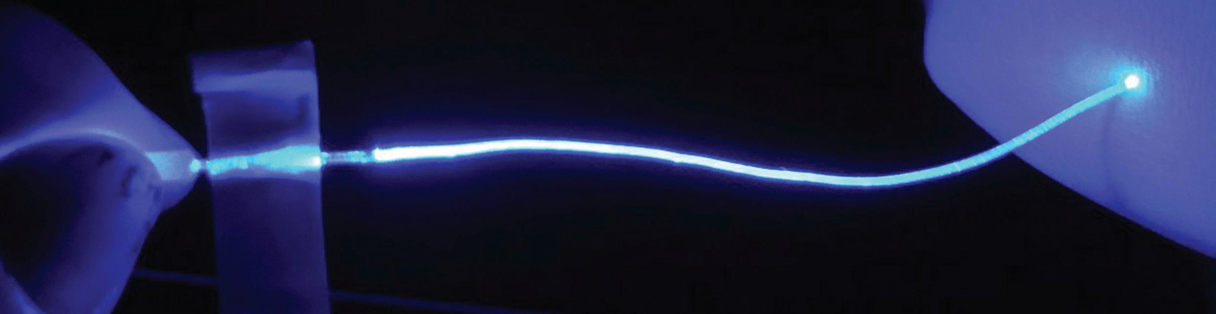 MIT engineers have designed a soft hydrogel optical fiber (shown illuminated) that stimulates peripheral nerves, and could help researchers in identifying the origins and treatments of nerve-related pain.