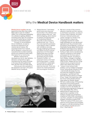 Why the Medical Device Handbook matters Medical device suppliers are way beyond the times when they merely filled orders to spec for medtech OEMs. From incorporating steerability into catheters to getting validation and testing done right, the companies serving the medical device industry have become specialized experts. Through our annual Medical Device Handbook, we seek to harness this expertise for the medical device industry. We requested articles from medical device designers, outsourcers and consultants that avoided marketing pitches and instead provided useful information for our community. Whether medical device developers are new to, say, catheters, electronic components or rapid manufacturing, the nearly 50 articles in this issue should hopefully help them dip their toes into these areas. Here are just a few examples of the expertise to be had in this year’s Medical Device Handbook: