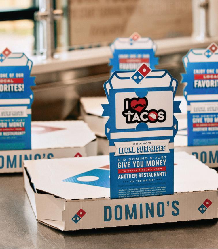 Domino’s might be the last company you’d expect to promote its competitors, but the chain did exactly that when franchisees in five U.S. cities stuffed $50 gift cards from other local restaurants in their delivery boxes in November. In the campaign, Domino’s touted its support for independent restaurateurs who struggle with third-party delivery fees. To encourage its customers to order from these restaurants without using a third-party app, Domino’s purchased and gave away 2,600 gift cards. One of the beneficiaries: Grammy’s Goodies in Wheat Ridge, Colorado, which serves pizza and other Italian food. “Our franchisees benefit from being part of a brand that has operations and technology built for delivery,” said Russell Weiner, Domino’s chief operating officer. “However, many small restaurants don’t have a system for delivery. Meanwhile, third-party delivery apps are charging local eateries high fees to deliver, which are taking away much of their earnings.” A Domino’s video about the campaign concluded with a forceful message: “High delivery app fees hurt customers and local restaurant owners. Help your local restaurants thrive by ordering directly from them.”