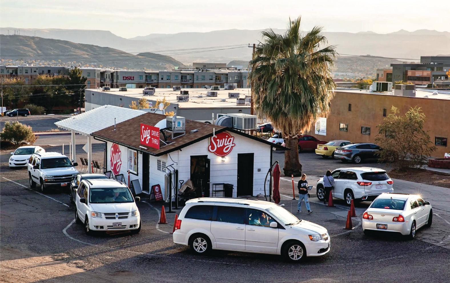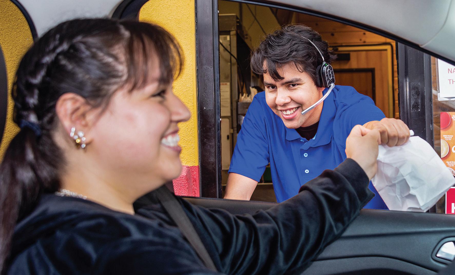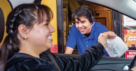 Bo lenecks, particularly at order points, can significantly impede drive-thru e ciency. Typically, customers may take 30–45 seconds to place an order at fi xed menuboards, causing delays even before timing begins. Brands like Swig are pioneering the adoption of advanced drive-thru technologies, such as upstream ordering, to prioritize throughput over mere speed. is approach does not aim to meet a standard time goal per car but ensures a steady flow of vehicles, potentially serving up to 120 cars per hour. Swig, using Crisp Restaurant Technology, has become known for operating one of the nation’s fastest beverage drive thrus. More than just facilitating rapid service, Swig enhances the customer experience with face-toface interactions at the ordering point and streamlines the process by using Crisp’s technology to quickly access customers’ favorite drinks through a mobile POS based on loyalty information.