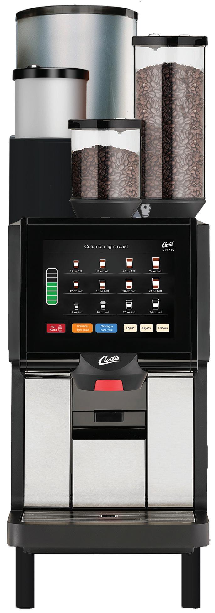 e Curtis Genesis Skyline was designed with operational efficiency in mind—especially applicable in the drive thru. This machine brews fresh co ee from whole beans and is the fi rst of its kind. e Curtis Genesis Skyline has the ability to automate co ee output based on demand. Maximum speed can serve customers quickly and e ciently— allowing operators to serve the freshest coffee at top speeds. Not only can restaurants