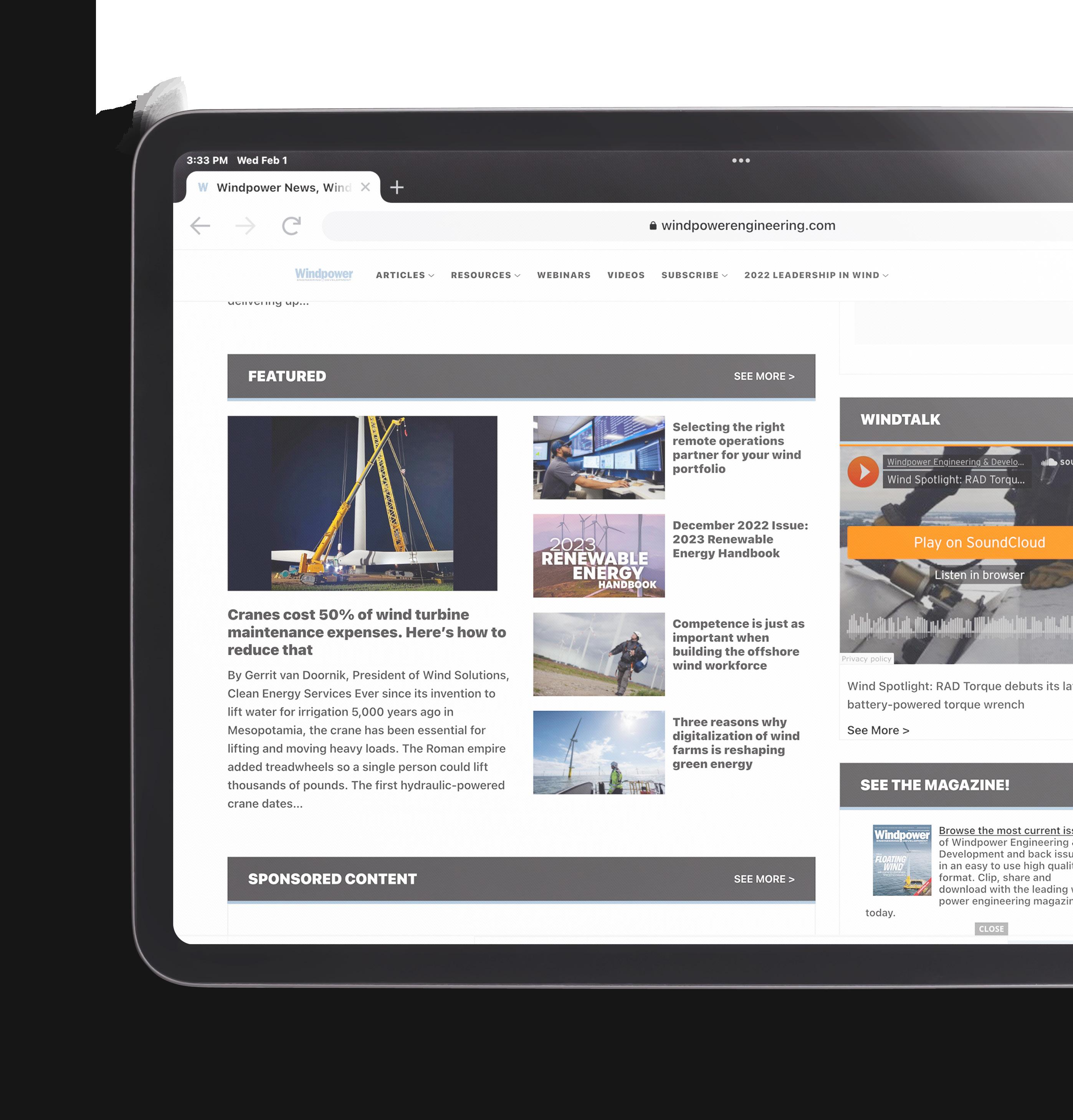 WINDPOWER ENGINEERING & DEVELOPMENT does not endorse any products, programs, or services of advertisers or editorial contributors. Copyright© 2023 by WTWH Media, LLC. No part of this publication may be reproduced in any form or by any means, electronic or mechanical, or by recording, or by any information storage or retrieval systems, without written permission from the publisher.