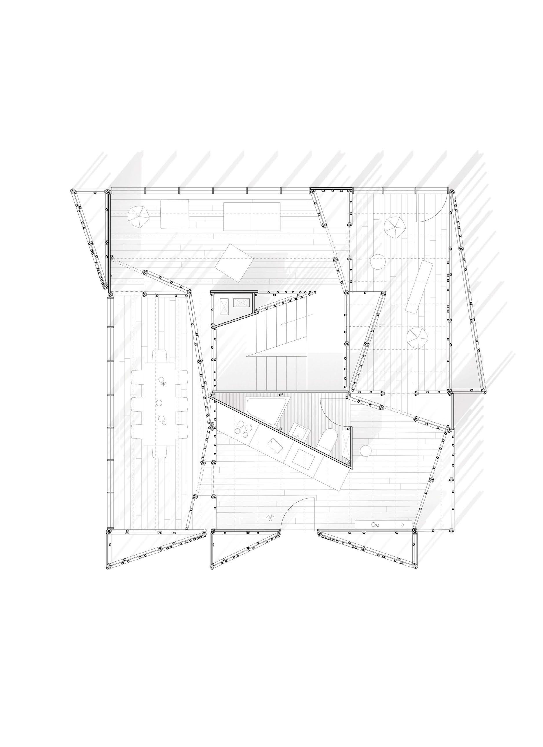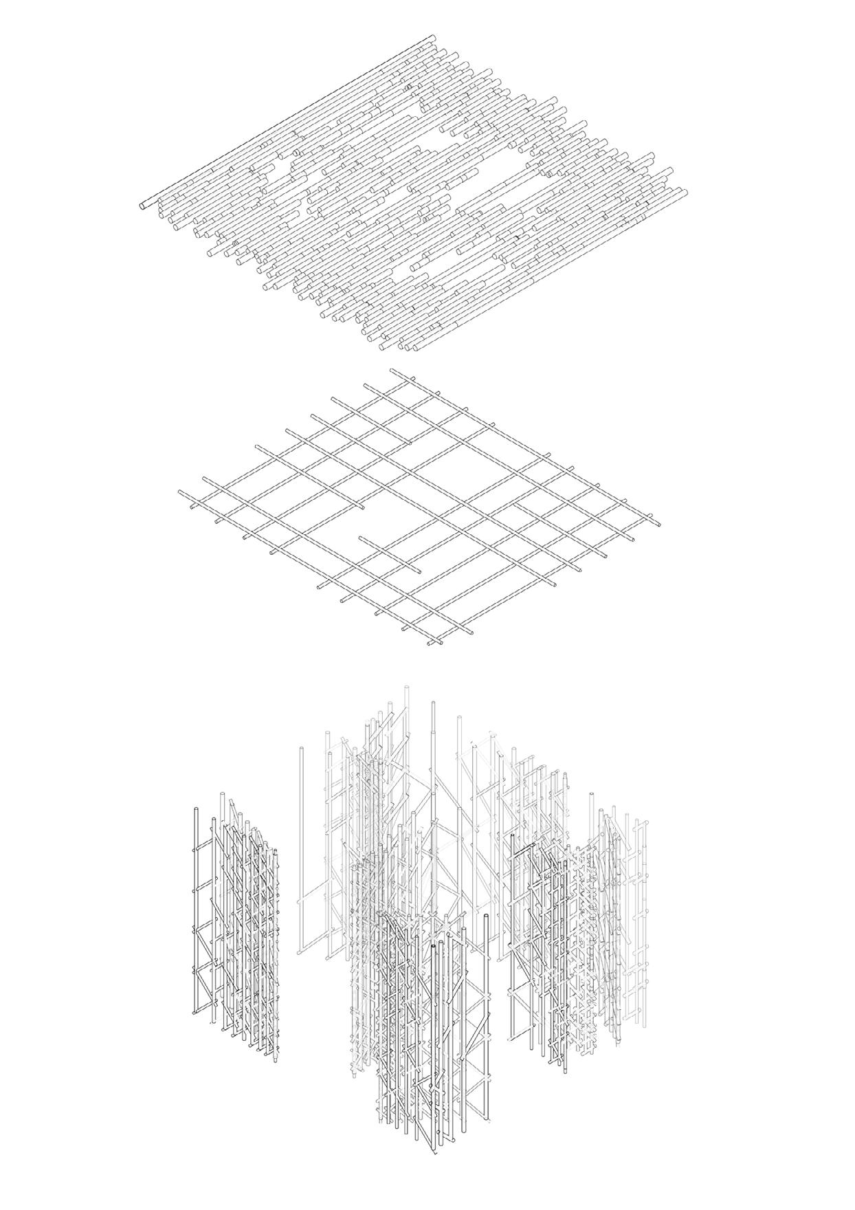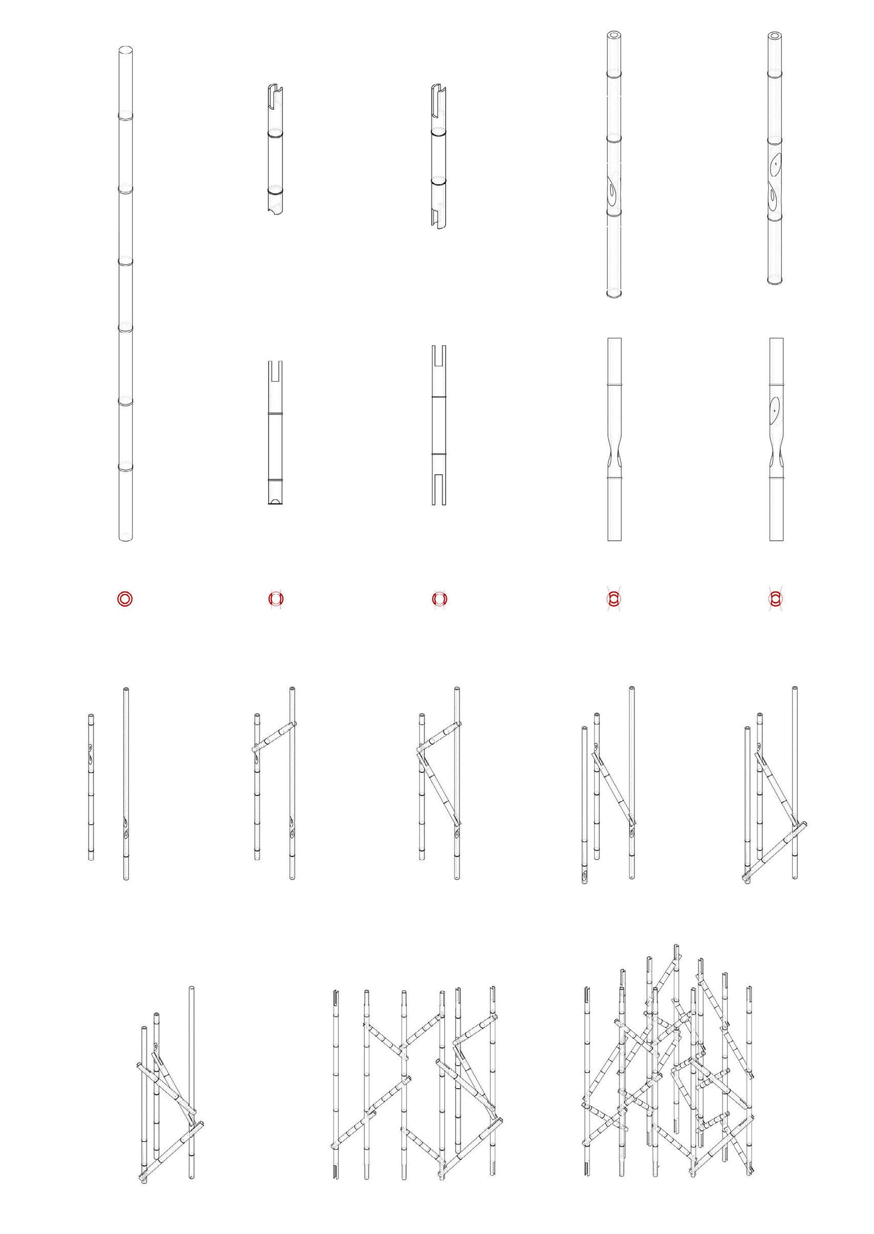 The project explores the architectural postential of bamboo as a non-uniform construction material that is widely available in many regions across the globe. The exploration starts with developing a joinery tactic which could be deployed across different scales. The joinery strategy is then developed into a structural system that