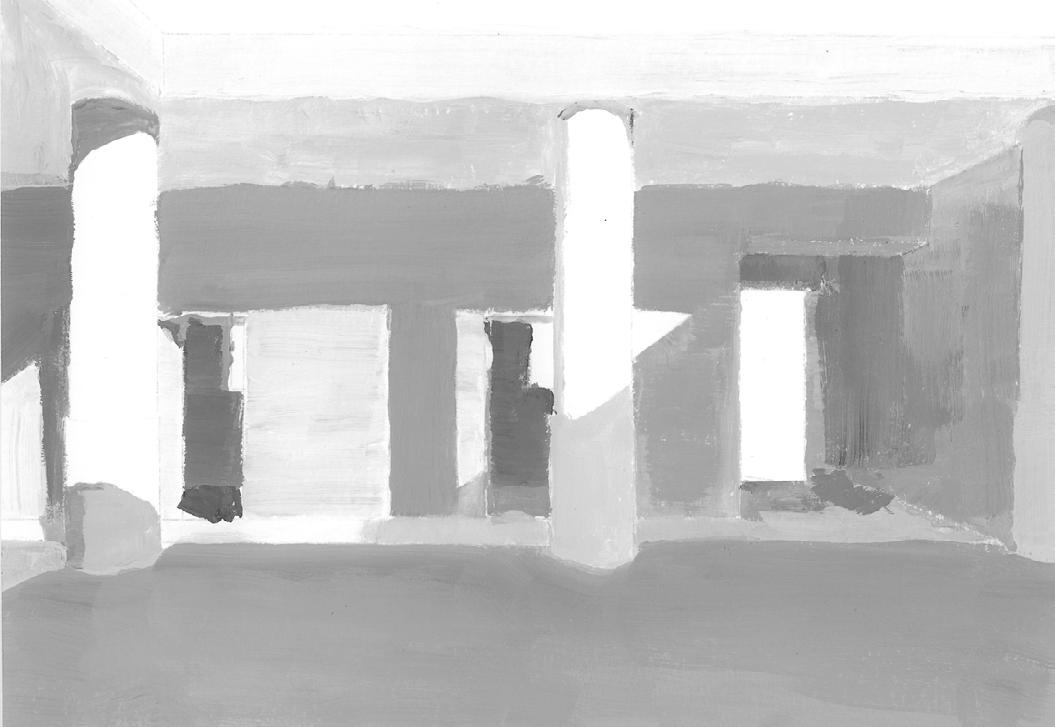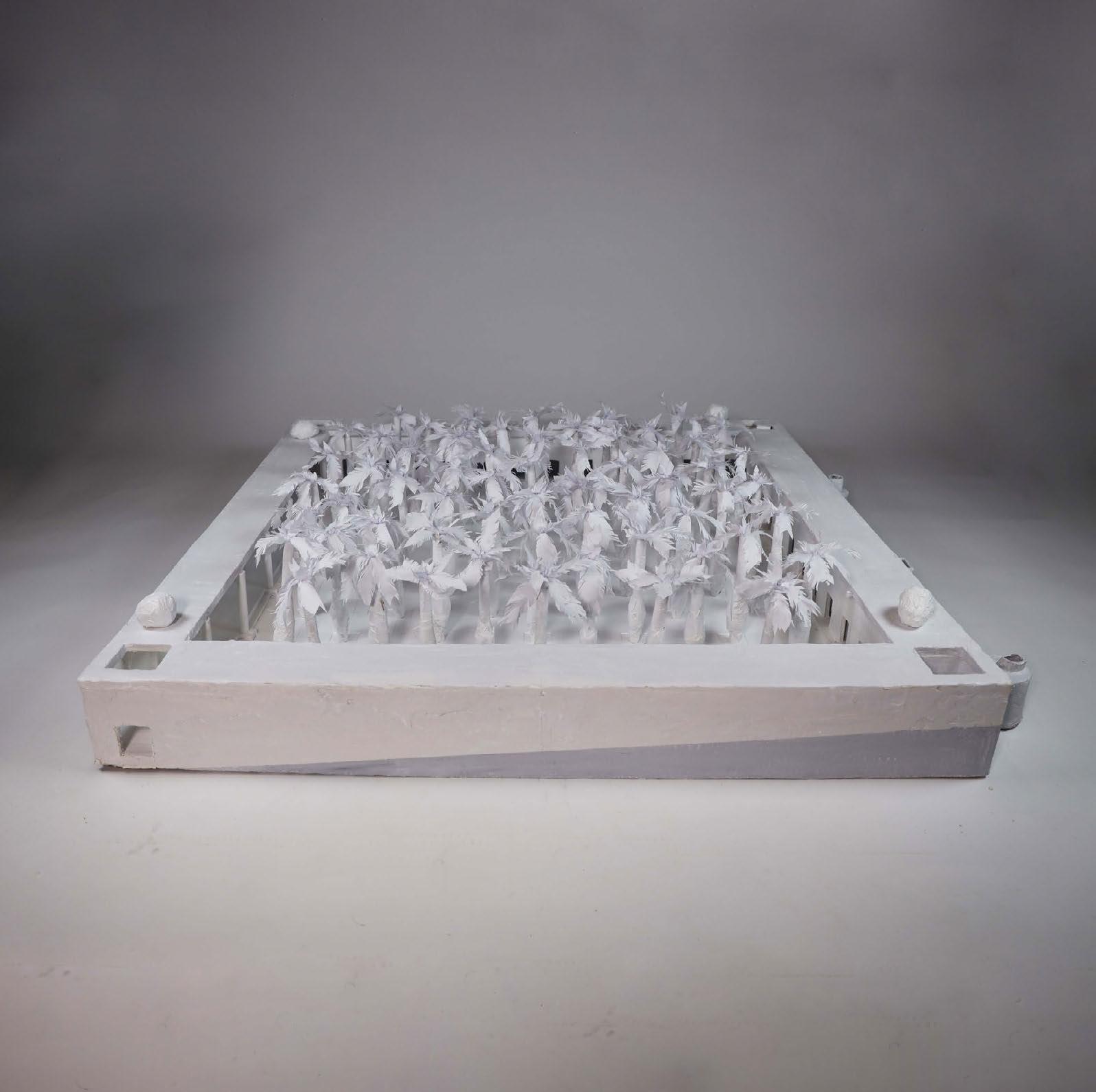 The project proposes an artist residence in the midst of the El Carmen desert of Chile. Utilizing mimesis representational methods of form finding, the resulting projects is an open courtyard that mediates the hilly landscape of the site, becoming a short cut of traversing the terrain. The courtyard is "furnished" by 56 Chilean palm trees, evoking an outdoor hypostyle hall. The midday sun would penetrate the structure, creating an almost psychedelic experience of seeing the interplay of light and shadows.
