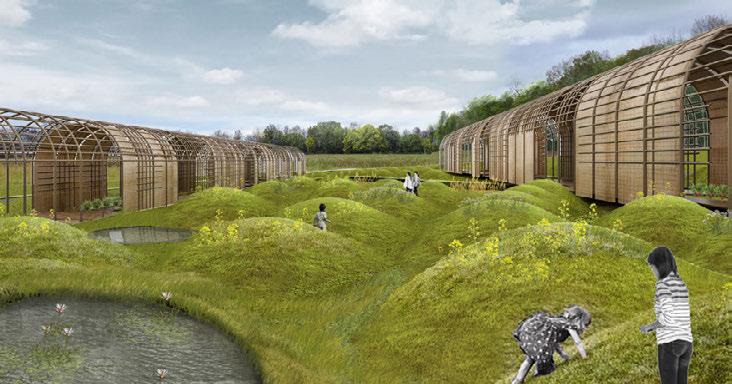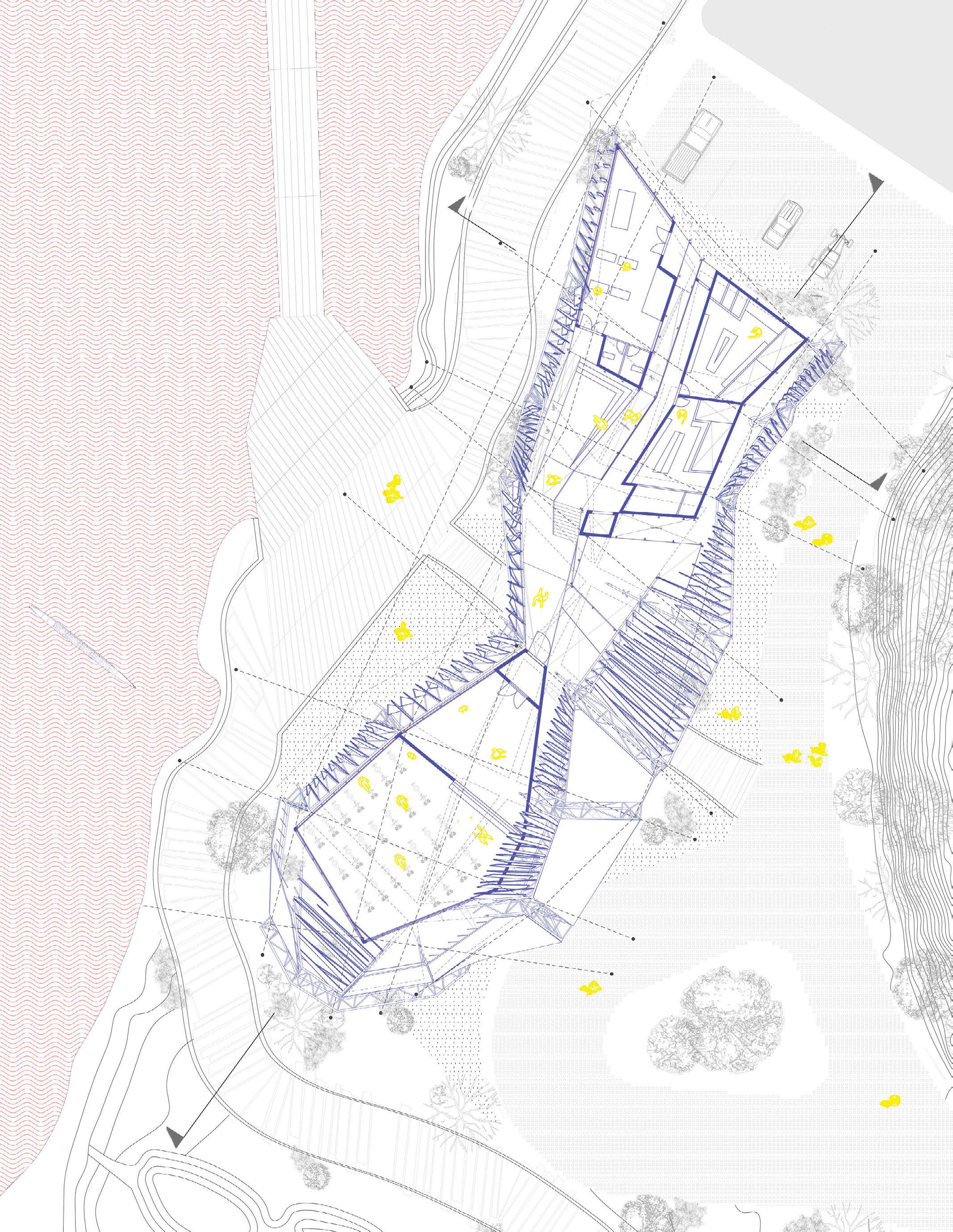 The project expolores a non-linear, de-centralize process of both site intervention and collaborative design efforts. Starting with a site that is polluted by a nearby fuel-power station, the projects aim to mitigate the pollution through a series of interventions: pollution sinking systems, interactive walkways and crop rotations. The lightweight structures are carefully rotated so that they will create wind tunnels that will distribute the fragarance of crops on the existing site. The process creates a de-centralized site experience that is not centered on the built structure, but rather a synthesis of hightened experience of existing elements on site such as wind, sculpted terrain, and vegetations.
