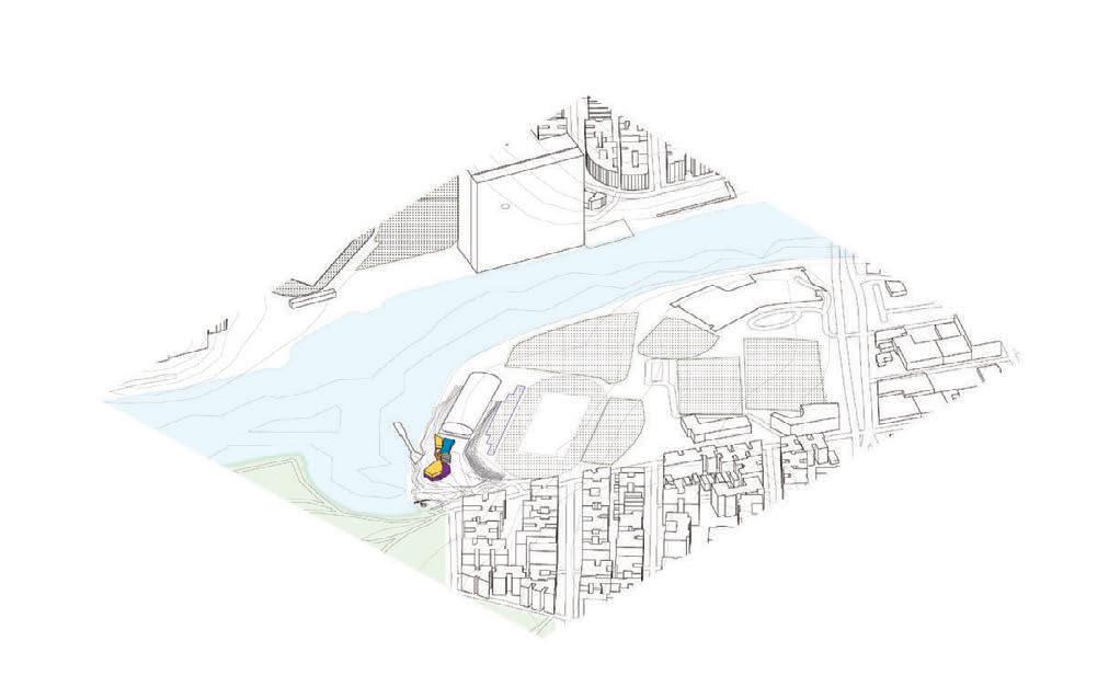 / The circulation of the structure is woven by a suspended steel walkway meandering through the various containers of activities. The programs are arranged in such a way that both the needs of the local community and the rowing team are accomodated, with the shared programs placed closer to the entry way, and slowly blends into the more private sectors. The canopy defines a light and airy space underneath, where occupants can gather while staying touch with elements of the nature.