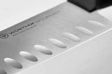 De petites poches d‘air sont créées par les fossettes ou les échancrures sur la lame. Celles-ci ont un effet positif de sorte que les tranches fines et les aliments mous et collants sont plus faciles à retirer de la lame.