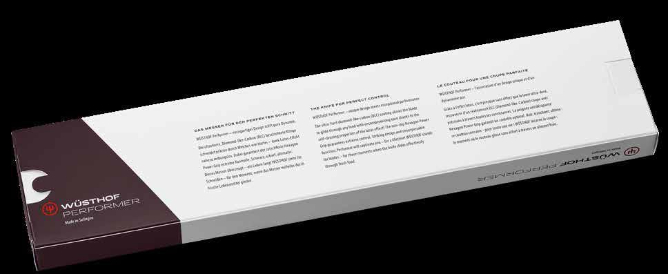 Les couteaux de la série Performer sont conditionnés dans une boîte en carton pliante (voir illustration) et sont répertoriés dans le catalogue sous le numéro d‘article et le code EAN correspondants.