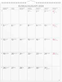 Iso ja selkeä suunnitelmakalenteri. Muistiinpanotilaa jokaiselle päivälle. Kalenteri sisältää liputuspäiviä, valittuja kirkkopyhiä ja juhlapyhiä. Kääntöpuolella sekä suomen- että ruotsinkieliset pienennetyt kalenterit. FSC®