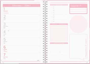 Sidottu, päiväämätön kalenteri, kuminauhalla. Pehmeä roosa kartonkikansi hopeapainatuksella, valkoinen merkkinauha ja paperitasku takana. Hyvä suunnitteluväline sisältäen tehtävälistoja joka kuukaudelle, viikolle ja tulevalle kuukaudelle. Tilaa päivittäisille merkintöille ja pistesivuja omille luomuksille. Englanninkielinen sisältö. Valkoinen paperi, 90 g, 128 lehteä (256 sivua). FSC®