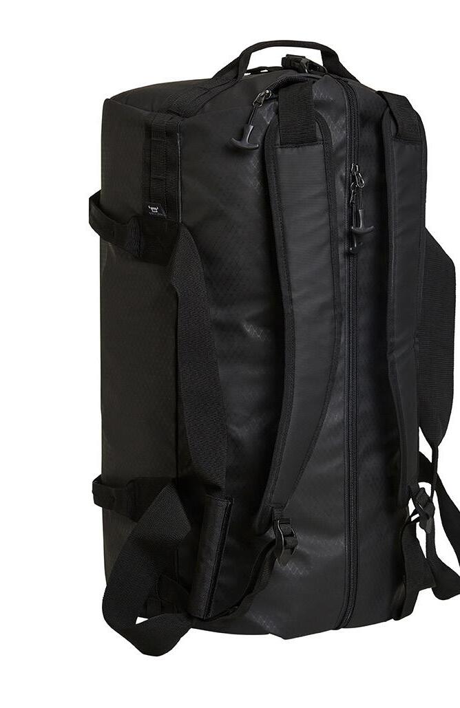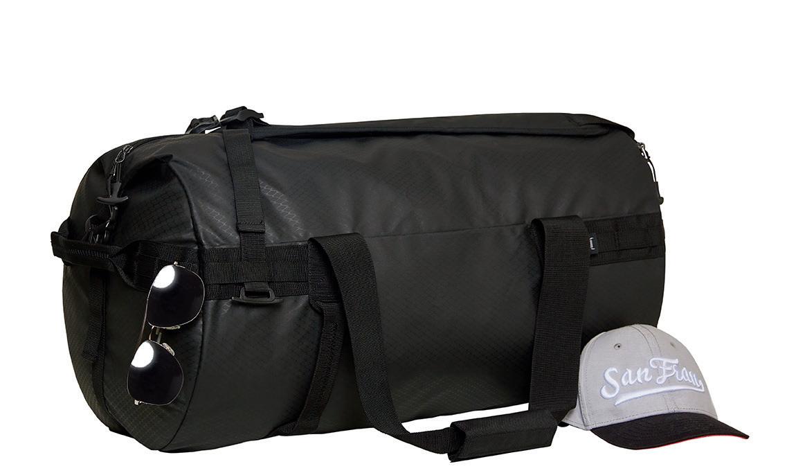 Kätevä urheilumatkalaukku repputoiminnolla; tilavat lokerot vetoketjuilla; erilliset kädensijat; kantokahvat ja piilotetut, pehmustetut ja pituussäädettävät olkahihnat.