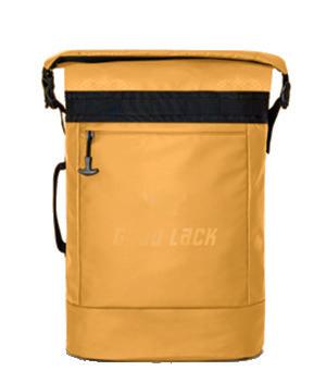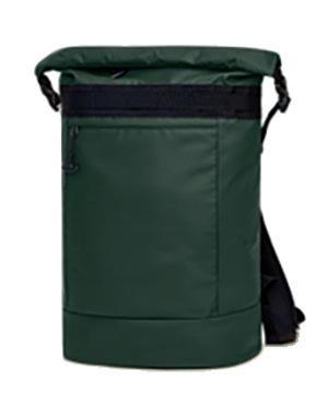 Laadukkaasti valmistettu roll-top-reppu, monella taskulla ja säädettävillä hihnoilla.