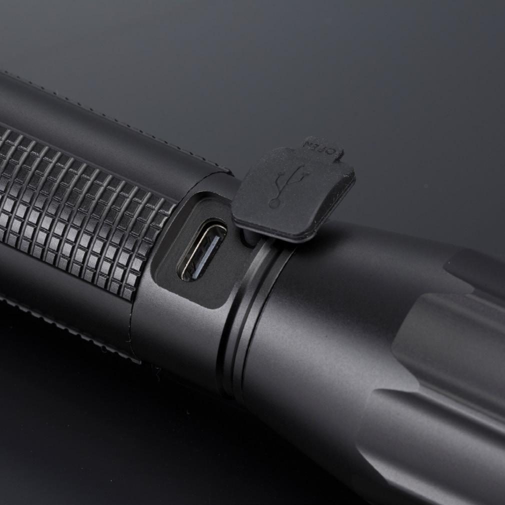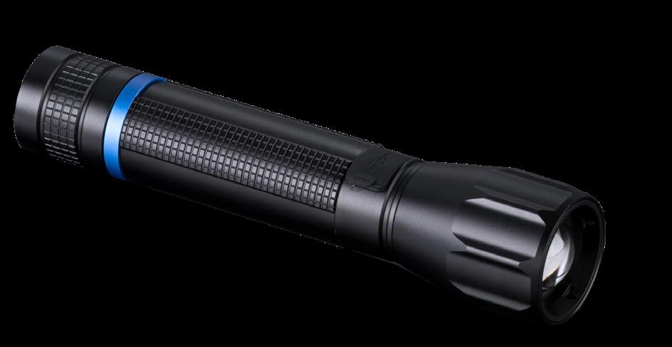 Kestävä ja tehokas taskulamppu, jossa on säädettävä valokeila (kantama 200 m) ja viisi valotilaa. Toimii sekä ladattavalla akulla (mukana) että tavallisilla AAparistoilla. Roiskevedenkestävä, kevyt ja helppo ladata sisäänrakennetun latausportin kautta.