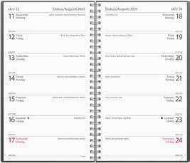 Ajanvarauskalenteri keinonahkakannella jonka aukeamalla kaksi päivää, tuntijaotus 07-21, 15 minuutin välein, kuukausitaulukot joka sivulla ja kuusi saraketta. Kalenteri sisältää nimipäivät, kansalliset pyhäpäivät, liputuspäivät, kuun vaiheet, vuosiruudukot kuluvalle ja kahdelle seuraavalle vuodelle, vuosisuunnitelmat kuluvalle ja seuraavalle vuodelle, kalendaariset tiedot, yleiset pyhäpäivät Euroopassa, taulukkoalmanakan vuosille 2025-2030 ja luettelon näiden vuosien tärkeistä päivistä.