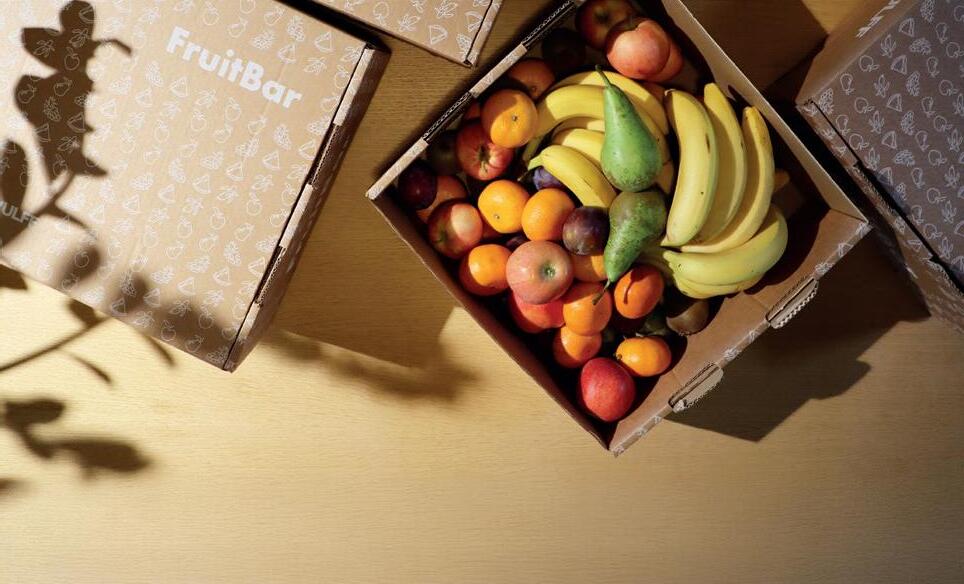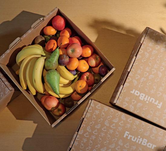 Wulff FruitBarin hedelmät toimitetaan työpaikoille laatikoissa, jotka on valmistettu 100 % kierrätysmateriaalista. ”Laatikko toimii irrotettavan kantensa ansiosta myös näppäränä tarjoiluastiana. Kansi pois ja värikäs hedelmäbuffet