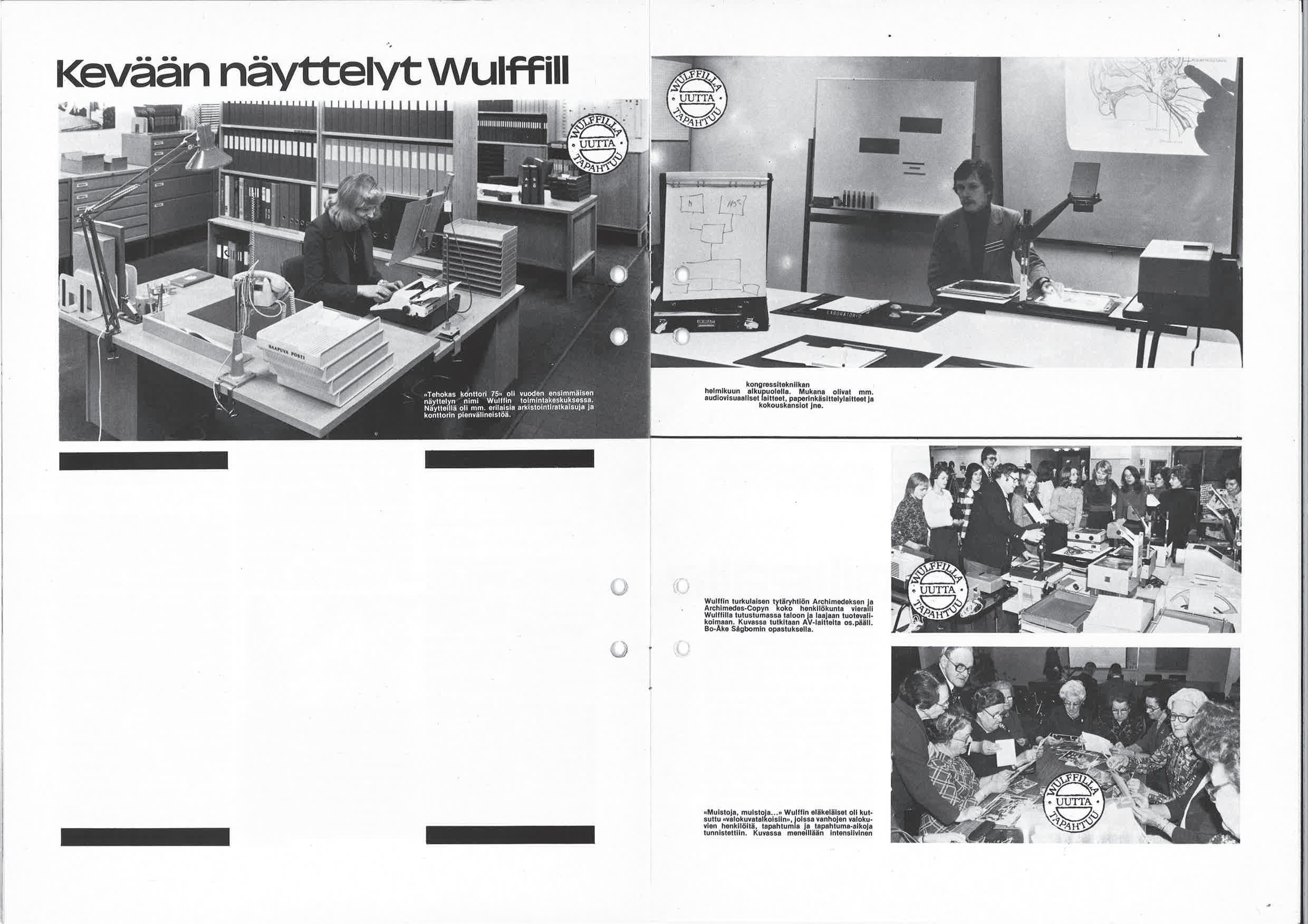 Wulffilla toimistojen arkisten pulmien ratkaisemiseen. Mapitusta ja arkistointia uudistettiin radikaalisti esimerkiksi karusellihyllyillä. Tehokkaampi palaveritekniikka piti sisällään
