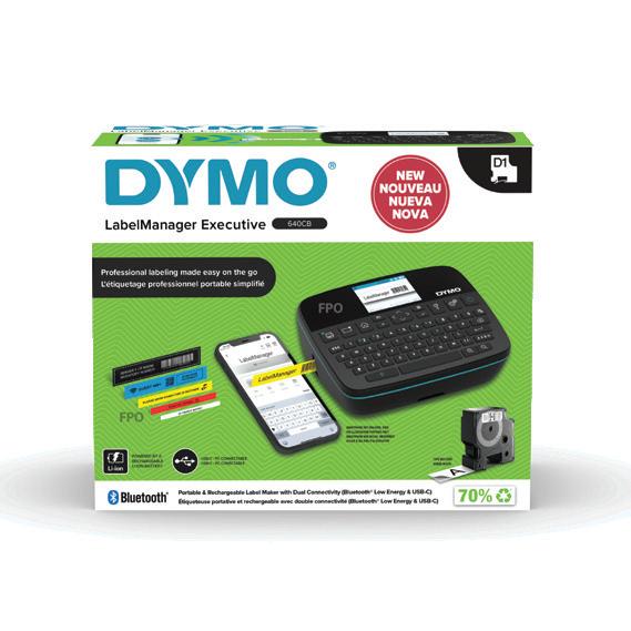 LabelManager® Executive 640 CB tekee merkintöjen tekemisestä helppoa missä tahansa. Ladattava litiumioniakku ja kompakti rakenne tekevät siitä ihanteellisen liikkuvaan käyttöön. Teksturoitu otepinta takaa miellyttävän käsittelyn, ja korkearesoluutioinen näyttö tarjoaa erinomaisen luettavuuden sekä monipuoliset toiminnot etikettien vaivattomaan luomiseen. USB-C liitetävä