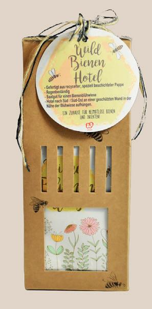 Das Wildbienenhotel ist aus laminierter, recycelter Naturpappe, mit Wellpappe und Holzwolle befüllt, damit die Bienen nicht ihre Flügel verletzen und hält aufgrund einer speziellen Beschichtung den Regenschauern stand. Ab 5.000 Stück können wir das Wildbienenhotel in 4c bedrucken.