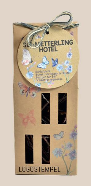 Das Schmetterlingshotel ist aus laminierter und recycelter Naturpappe und verträgt auch den ein oder anderen Regenschauer. Dennoch sollte es etwas geschützt nach Süd, Süd-Ost aufgehängt werden, denn ein feuchtes Bett hat niemand gerne. Ab 5.000 Stück können wir das Schmetterlingshotel in 4c bedrucken.