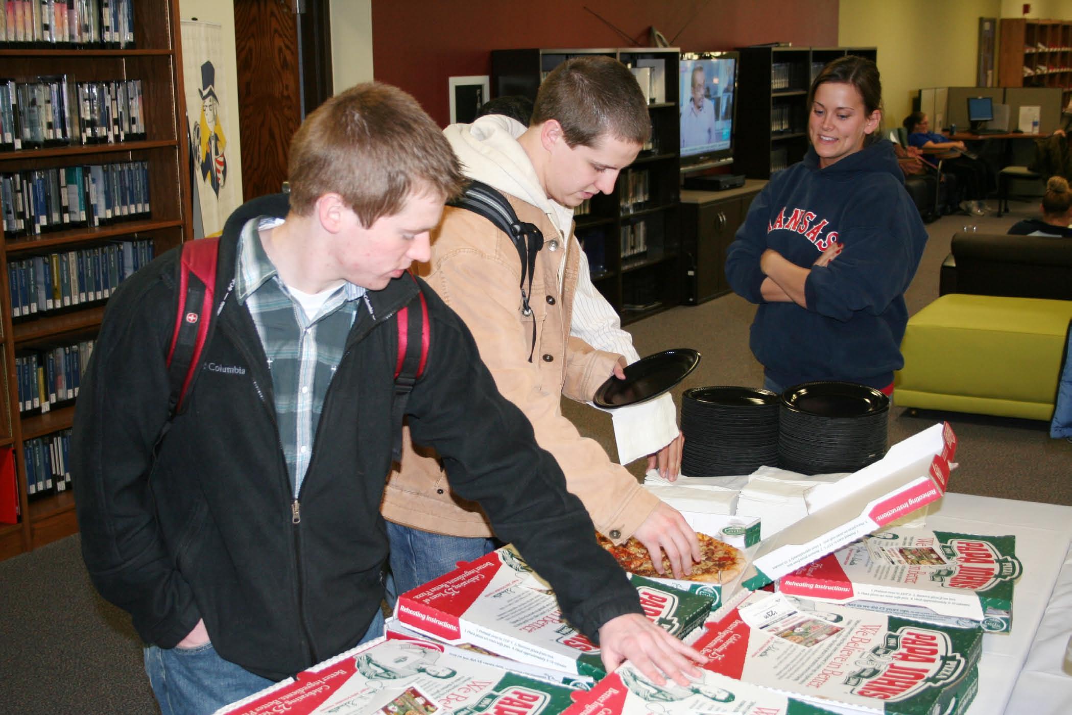 Success Week: Students Sam Spyres, Ethan Komp and Brandy Mann grab free pizza in between classes in Mabee Library. The pizza was offered as a kick-off to Success Week events and will be offered again on Friday, Dec. 4.
