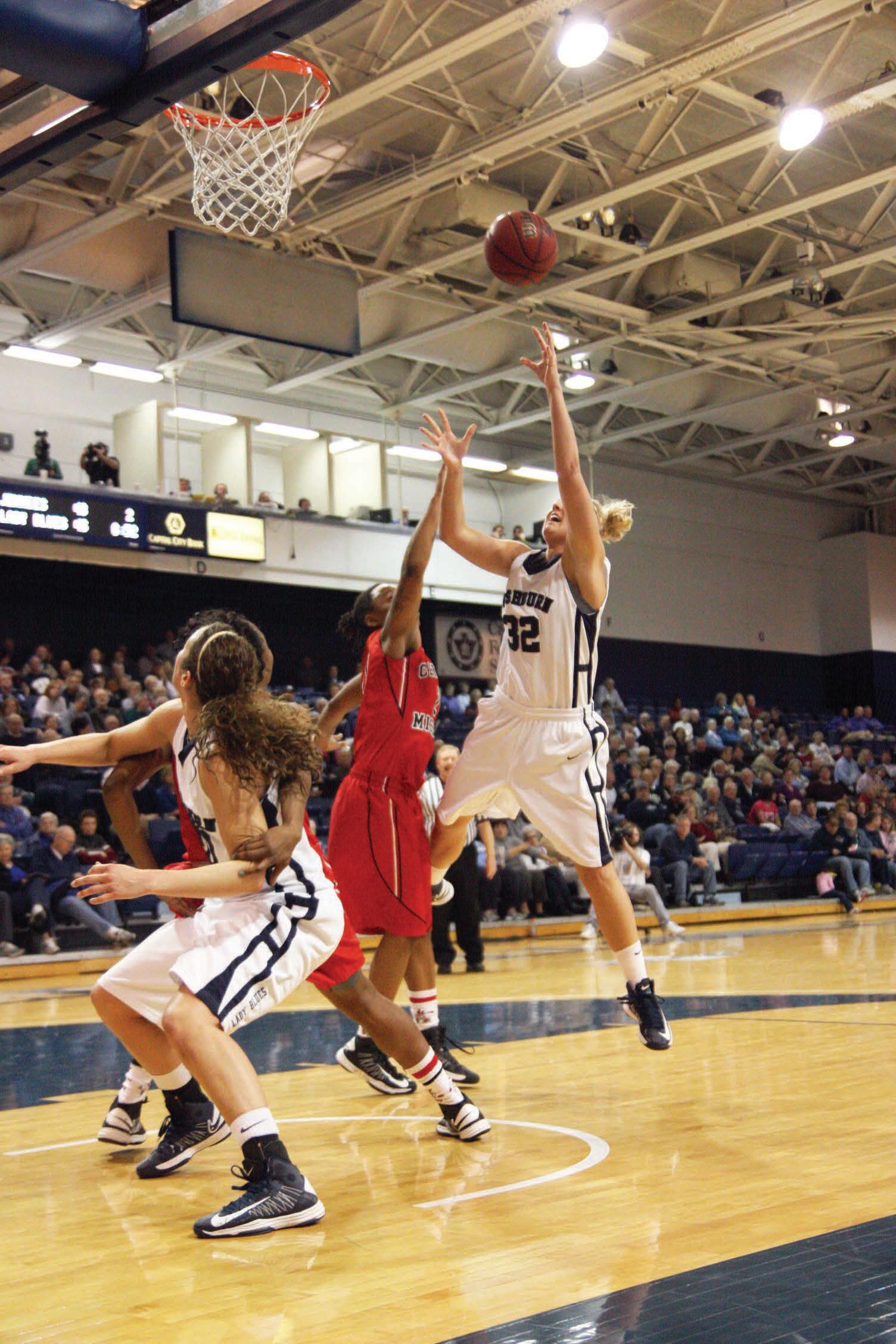 Almost There: Sophomore guard Casyn Buchman shoots a floater with her left hand over a Central Missouri defender. The Lady Blues will look to repeat as MIAA tournament champions .