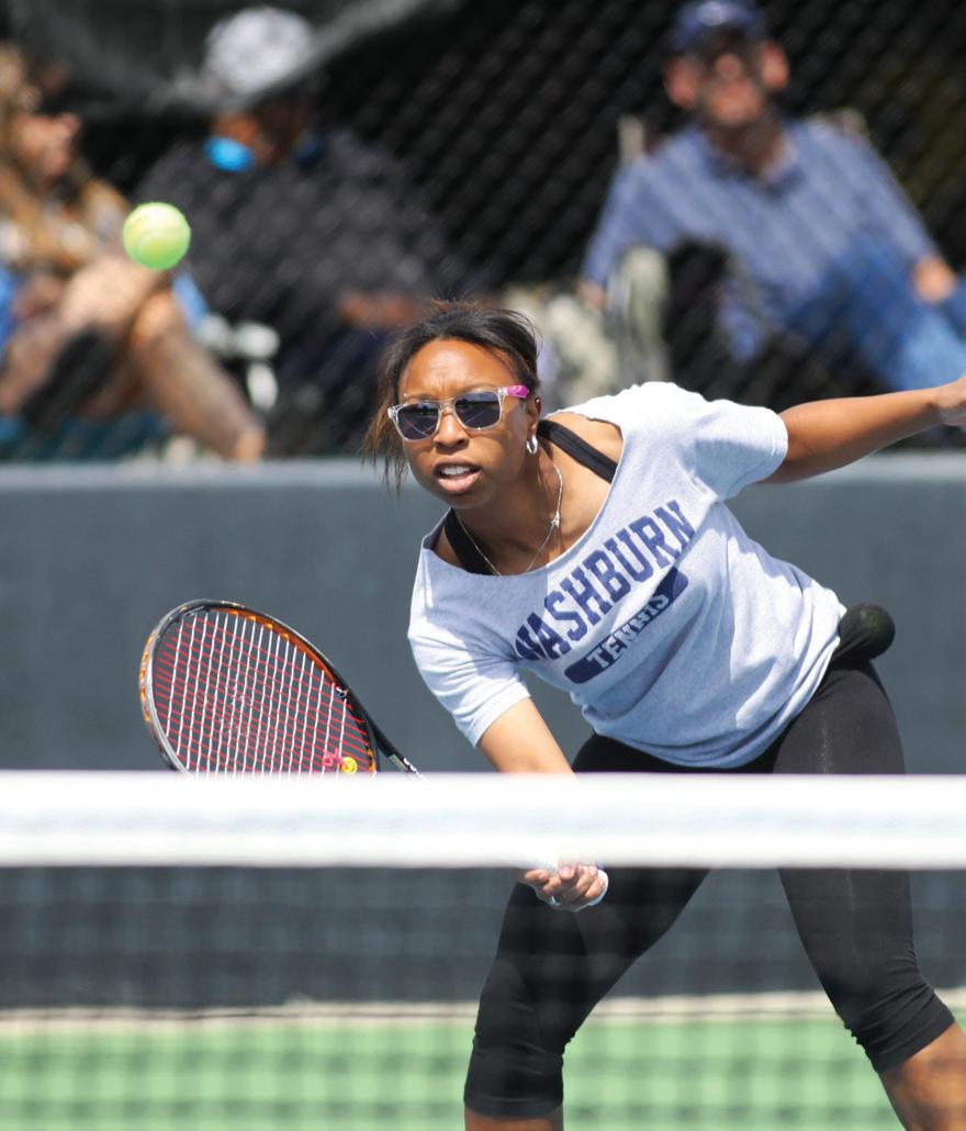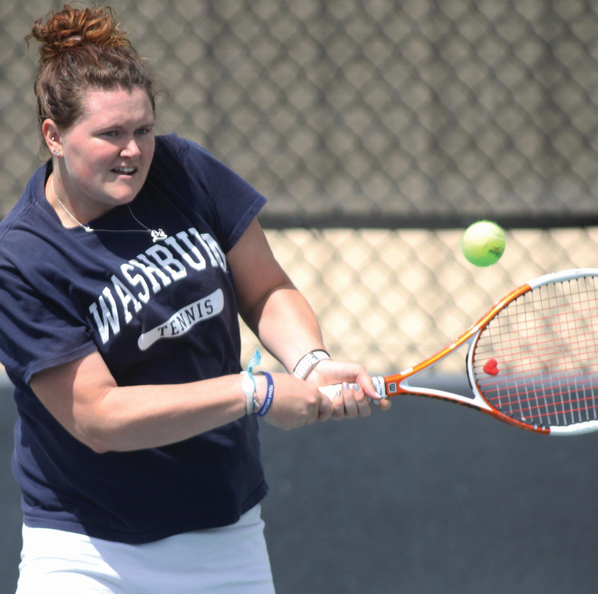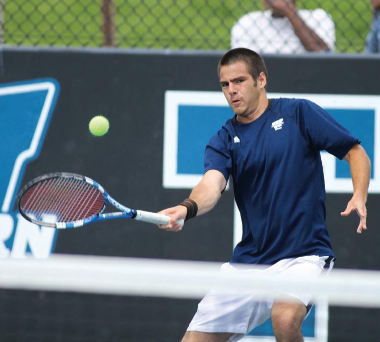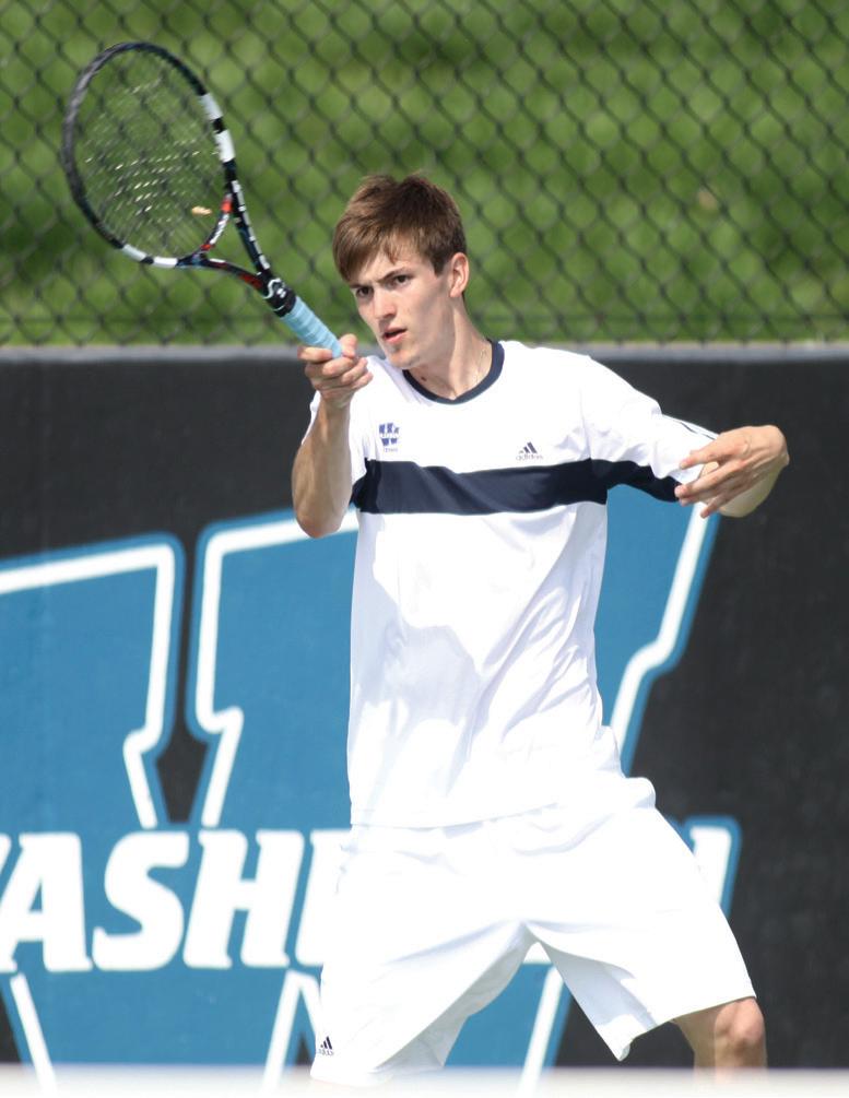 Sophomore Arkadiusz Kozaczuk (left) gets off a solid serve during a home match. Kozaczuk, from Warsaw, Poland, finished 13-9 in singles play. Kozaczuk nearly upset Wichita State’s Matheus Pereira in No. 1 singles. Fellow sophomore Bobby Florence (above) gears up for a forehand. The German native Laucht went 8-9 in No. 2 singles. Laucht and sophomore Bobby Florence also went 7-10 in No. 2 doubles play for the Washburn Ichabods.