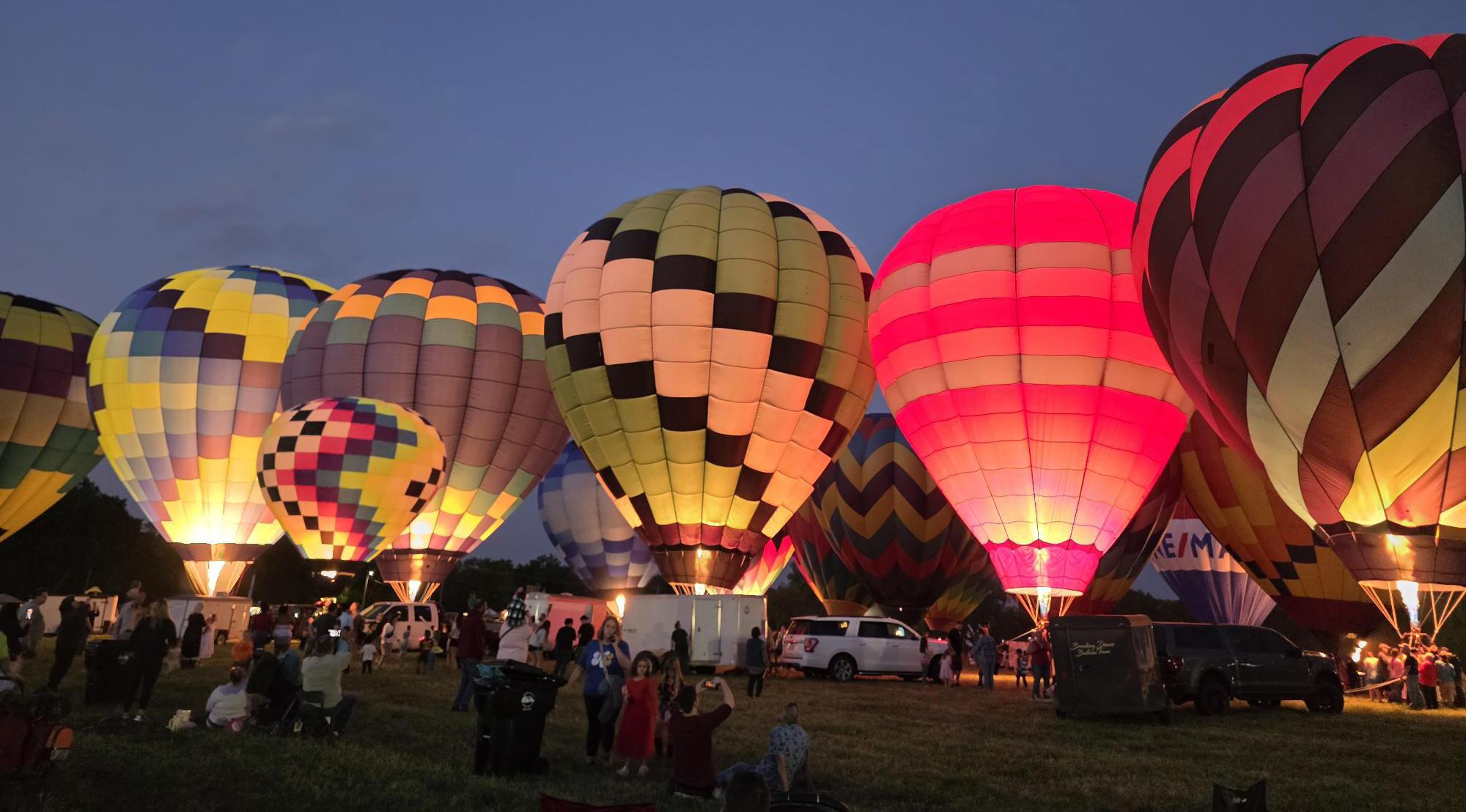 Hot air balloons of all colors and sizes light up the night. Topeka, Kansas hosts the annual Huff 'n Puff Rally hot air baloon festival around the month of September.