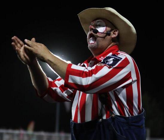Shawn "Boom Boom" Thompson entertains the crowd between events. The rodeo had a barrel man to distract bulls to give the riders a chance to get out of the arena safely.