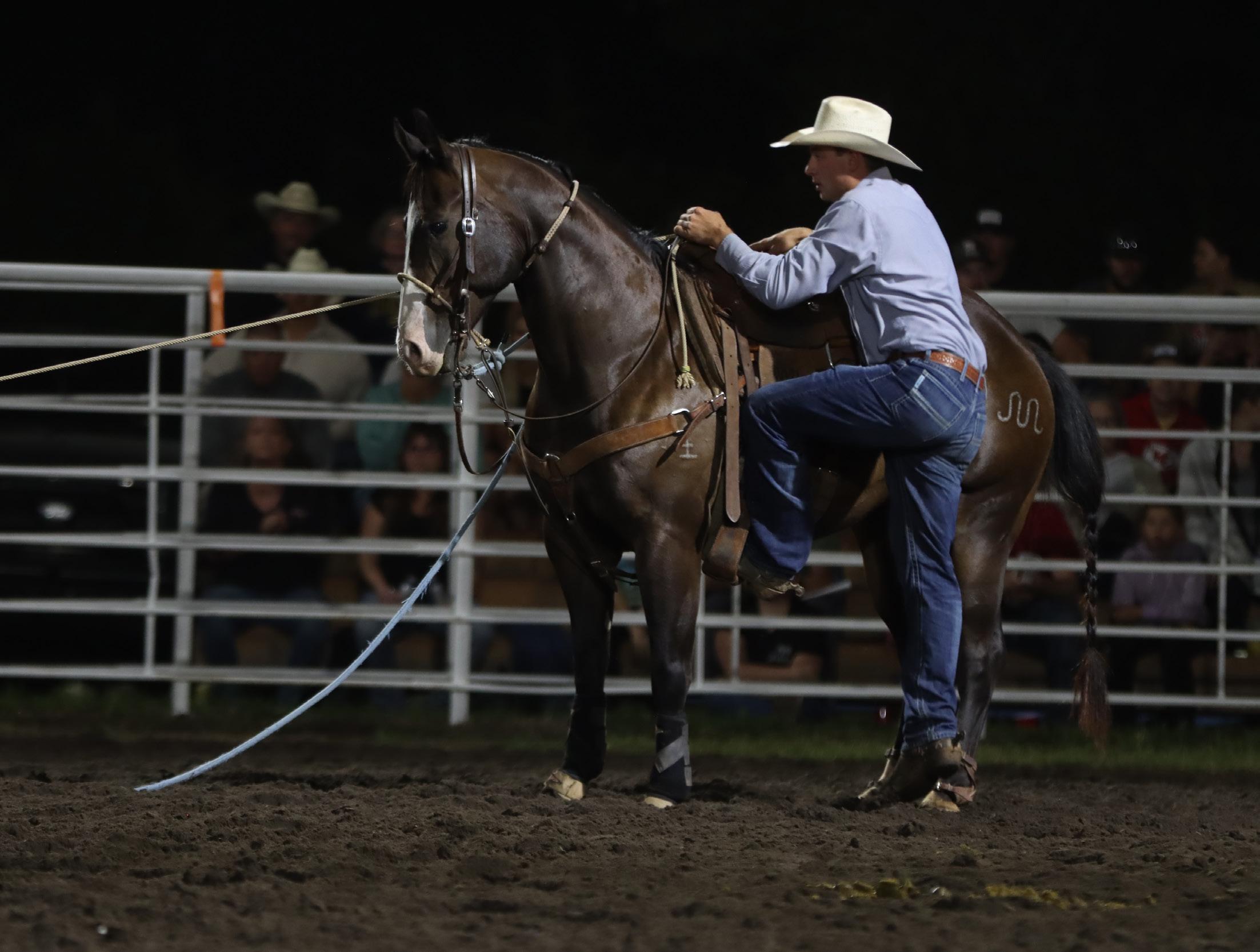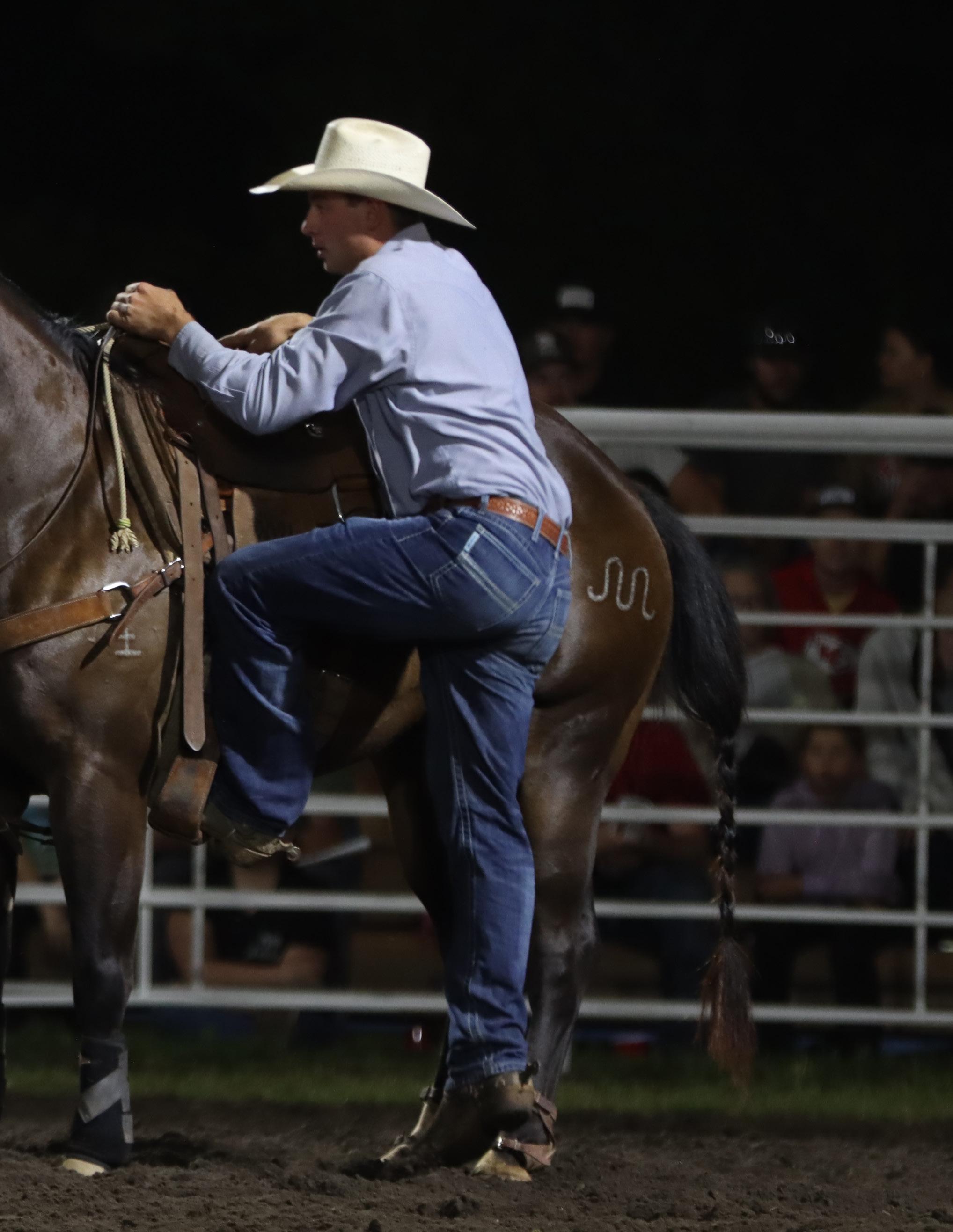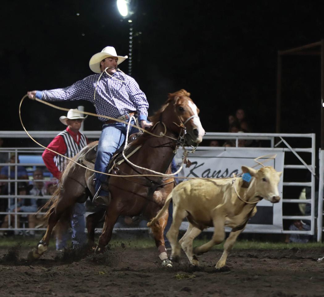 Left: Tie down roping requires the rider to catch a steer and hold it down by tying its legs. Kason Dyer of Ottawa, Kansas completed the task in 19 seconds.