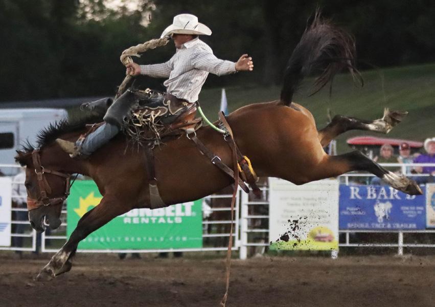 Middle: Tanner Hayes of Elkhart, Kansas rides Game Changer. In the saddle bronc event Hays earned a score of 75.5 on his ride.