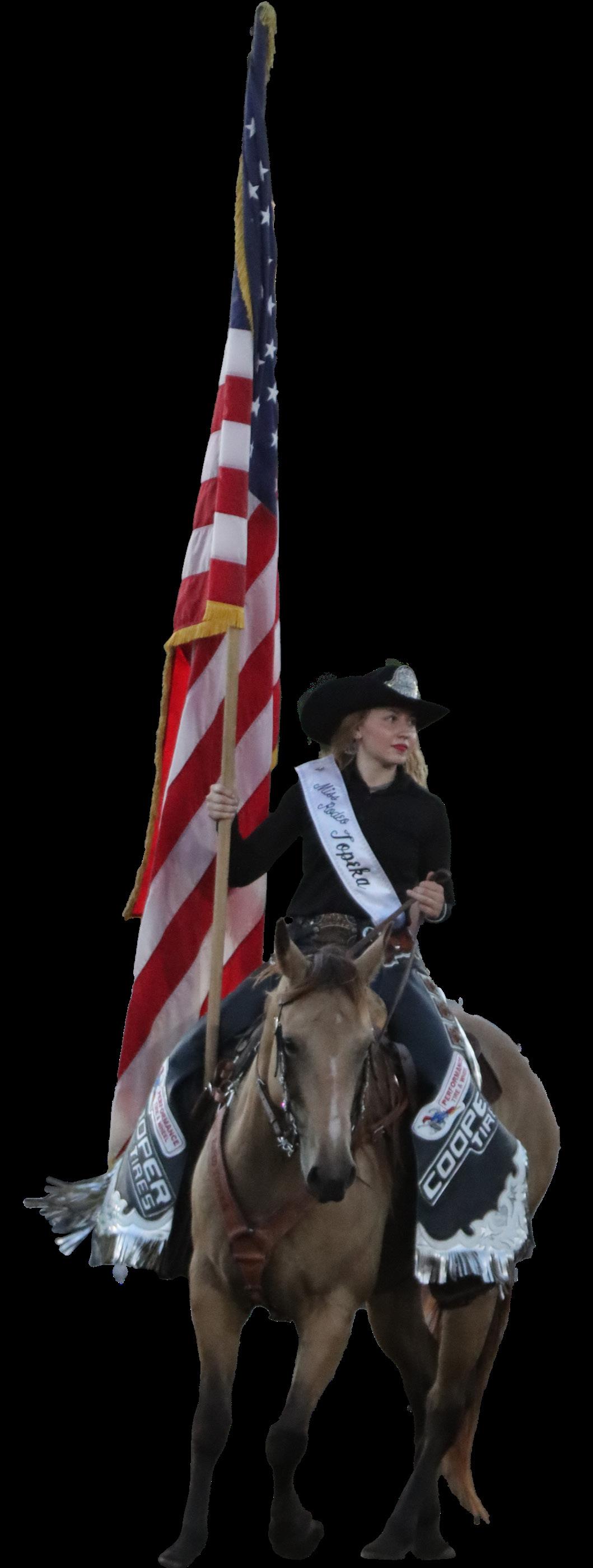 Kyndall Sextro, Miss Rodeo Topeka, carries the flag during the national anthem. Sextro was the 2024 rodeo queen and she was handing off her responsibilities as queen to Emmy Gibson, Miss Rodeo Topeka 2025.