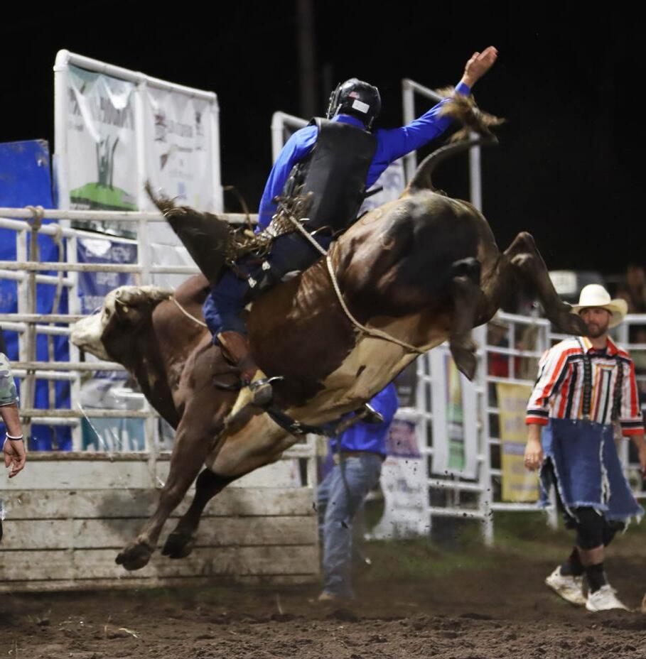 Right: Bull riding is the final event of the night and one of the crowd favorites. Brandon Ballard of New Hope, Kentucky defeated the bull Inamorata in his eight second ride. Ballard took home the cash purse with the best ride of the night.
