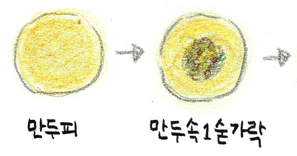 만두 속을 한 숟가락 넣고 만두피 가장자리에 물을 묻히고 모양을 만든다. 찜통에 물을 끓여 김이 오르면 빚은 만두를 넣고 15분간 찐다. 쪄낸 만두는 한 김 빠지면 먹는다. 만들기 4 1 5 2 6 3