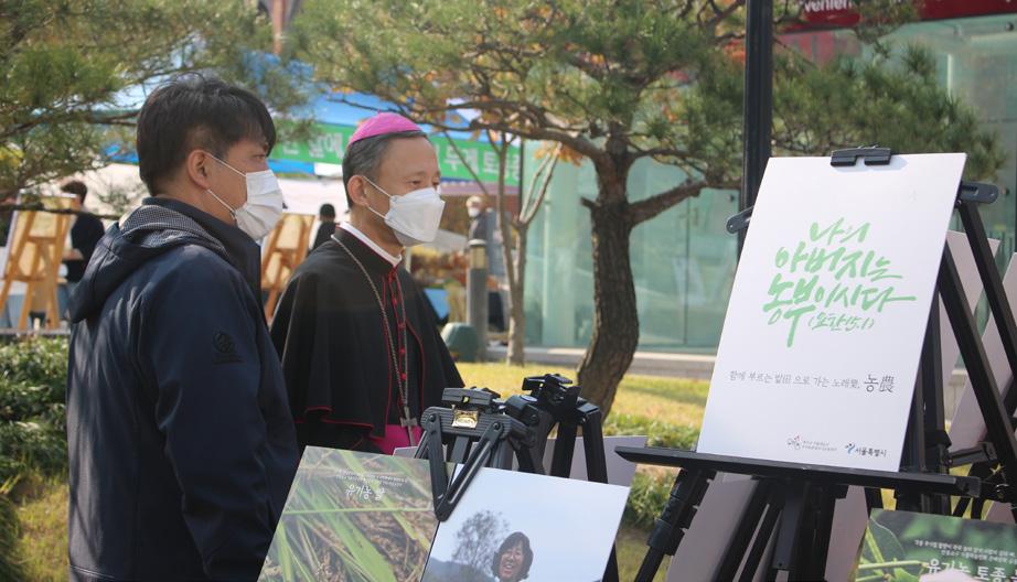 10월 30일(일), 2022년 가을걷이 감사미사 및 도농한마 당잔치가 진행되었습니다. 유경촌 주교의 주례로 진행된 미사에서는 전일 발생한 이태원 참사 희생자들을 추모하 고, “농부들이 농사를 짓지 않아 아무런 수확이 없다면 도 시도 존재 할 수 없고, 생존할 수 없다”는 강론 말씀을 통해 다시 한번 우리 농촌, 농민의 소중함을 느낄 수 있었습니다. 명동대성당 일대에 마련된 생명농산물 나눔마당에는 광주 대교구를 포함한 12개 교구 농민들이 직접 도시민을 만나 서로의 안부를 묻고 격려하며 생명을 나누었습니다. 또한 토종종자 이야기가 담긴 세밀화 전시도 도시민들의 이목을 사로잡았습니다. 이 외에도 농민과 생명농산물을 함께 전 시한 POP, 농업·농촌·농민의 소중함을 알리는 교회의 가 르침 등 다양한 전시물로 농農의 중요성을 알렸습니다. 가 톨릭회관 앞마당에서는 서울대교구 우리농 생활공동체, 농부학교, (주)에코푸드코리아외에도 교구별 먹을거리 마 당을 마련, 농민들과 명동대성당을 방문한 신자들의 한 끼 식사를 든든히 채워줬습니다.