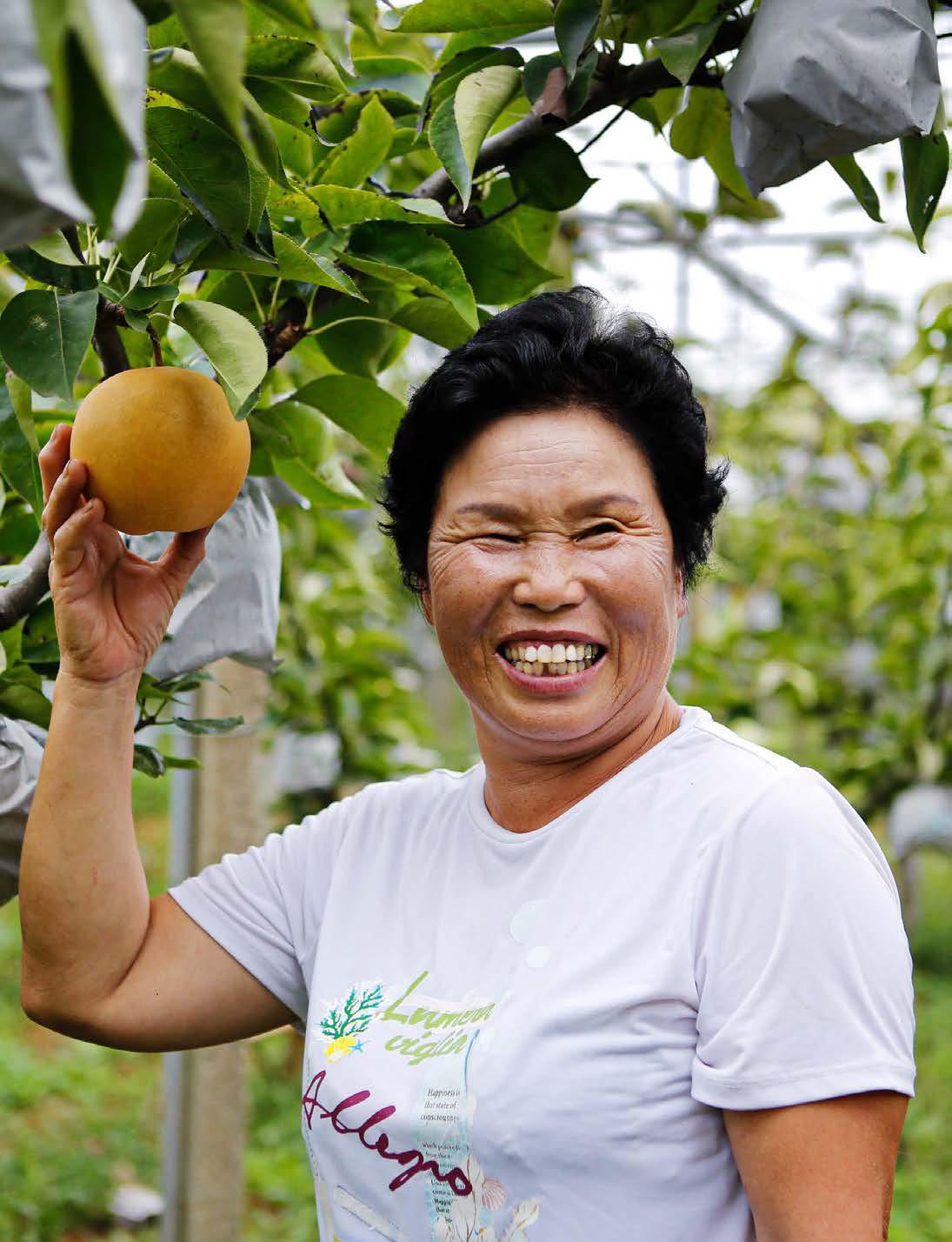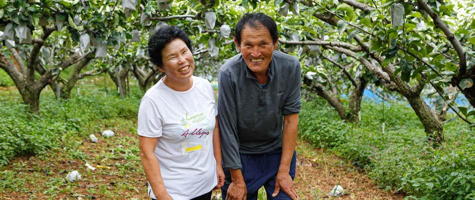 하 고 있다. 농사 자금과 함께 출하가 가능한 안정적인 판로 를 마련해주는 것이다. 이순옥 마르첼라 농민과 조순호 모세 농민은 지금까지 총 다섯 번의 사랑기금을 지원받았다. 2022년 사랑기금 선정 농가는 총 21개로, 농민과 동서지간으로 옆 농장에서 함께 배 농사를 짓는 조경호 안토니오, 윤효경 나탈리아 농민도 대상으로