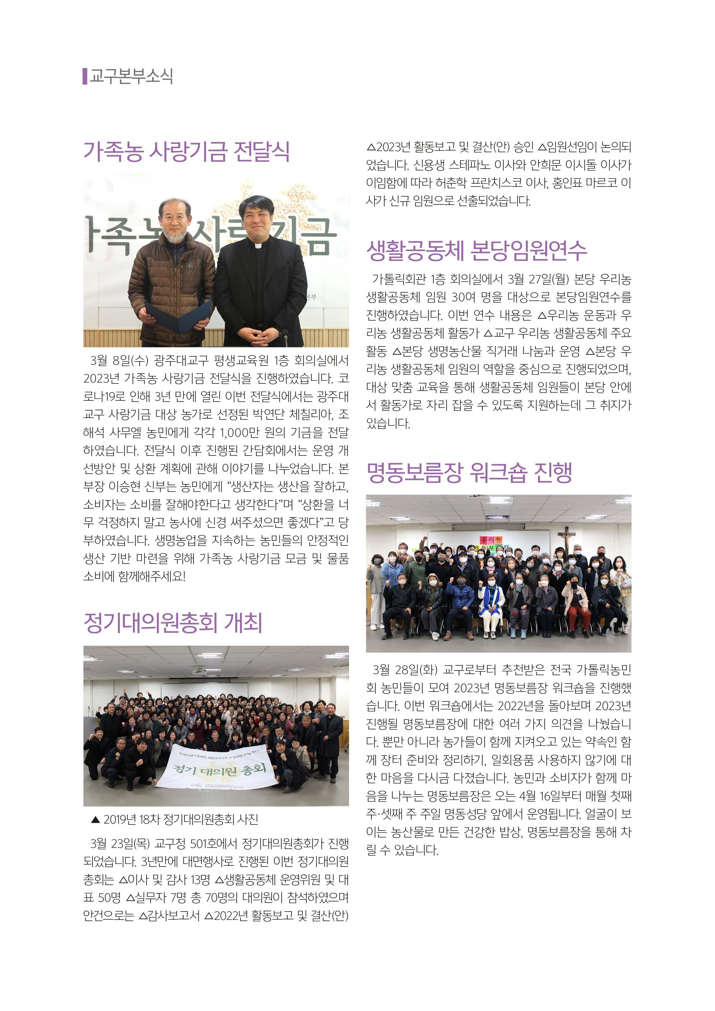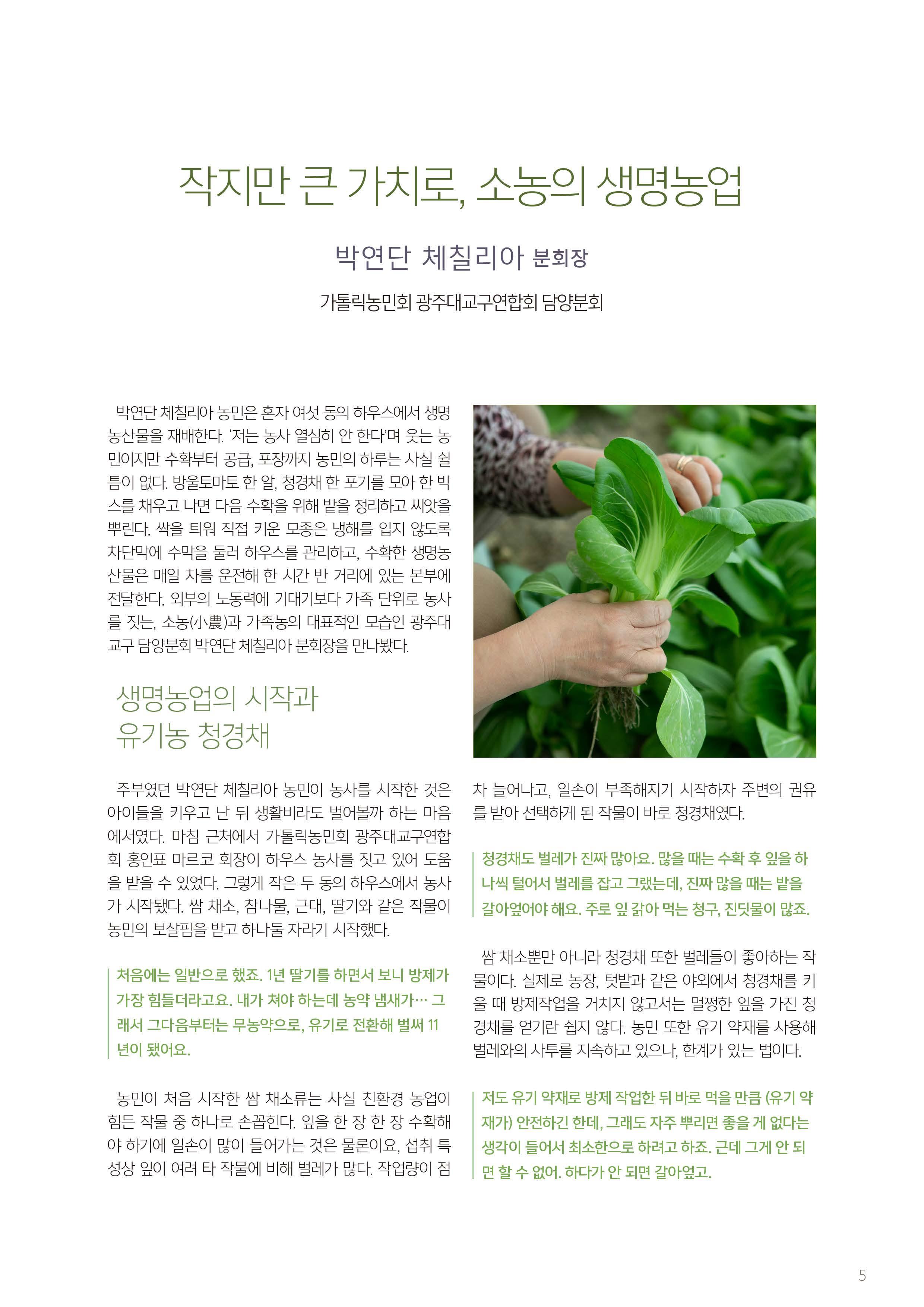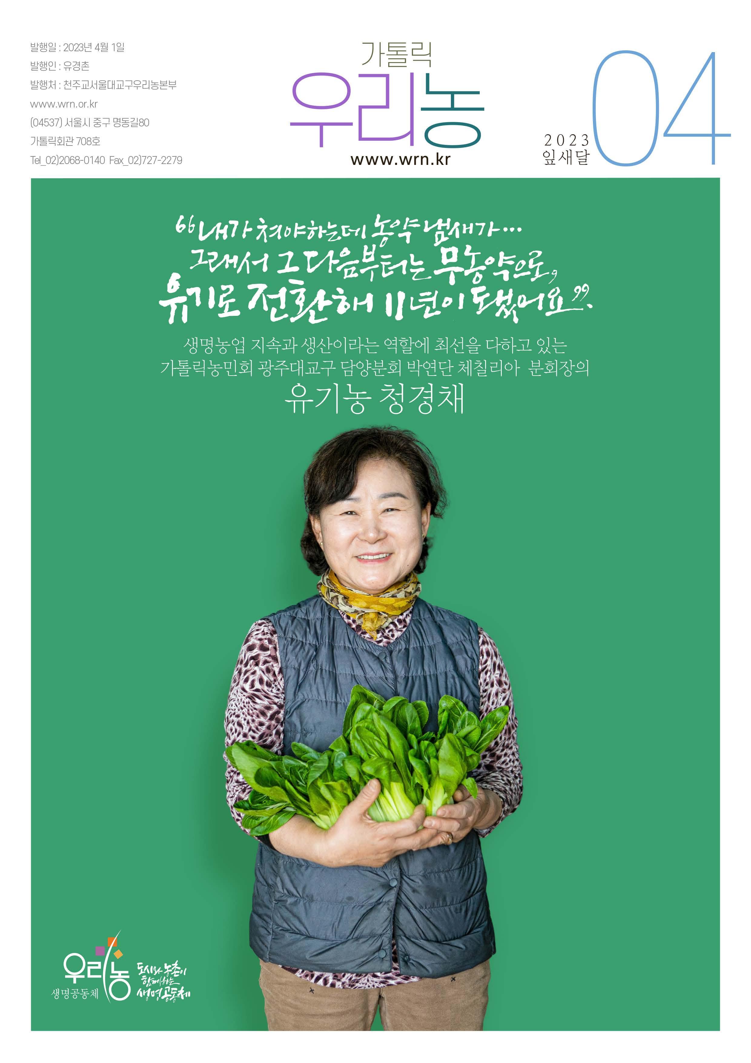 서울대교구 우리농촌살리기운동본부 월간 소식지 제343호 광주대교구 담양분회 박연단 체칠리아 농민 #우리농 #가톨릭농민회 #4월 #우리농운동 #가족농 #사랑기금 #가족농사랑기금 #유기농 #청경채 #방울토마토 #생명농업 #친환경 #소농 #그린푸드 #레드푸드 #비트차 #토마토 #새싹 #양배추 #피부암 #암 #질환 #한식 #청명 #곡우 #청경채겉절이 #겉절이 #김치 #토종종자 #보리콩 #돌나물 #물김치 #나물물김치 #할인 #신규 #예약 #전복 #전복할인 #두부 #우리농두부 #명동보름장 #해조류 #간편요리 #삼층거리파 #교구본부소식 #주문안내