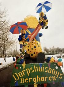 De wagens hadden in de eerste jaren thema’s die aansloten bij het lokale nieuws, zoals het ontstaan van de Groene Heuvels en ‘Brasil’, linkend aan restaurant de Picador. Na een aantal jaren is de groep overgegaan naar algemene carnavalsthema’s. Wat de Dorpshuisboys in de optocht herkenbaar maakten zijn de primaire kleuren die ze gebruikten, en de kleding van de pop op de wagen was hetzelfde als de kleding die de groepsleden droegen. De wagens werden alsmaar technischer en vooral groter en hoger, met kop tot wel 6 meter en ingebouwde trekker.” En liet je je auto op de route staan, dan was je bij de Dorpshuisboys aan het verkeerde adres. Rob, Ben en Manja lachen: “Tijdens een optocht is het een keer voorgekomen dat er nog een auto uit de Ploegstraat opgetild is door verschillende jongens om ruim baan te maken.”